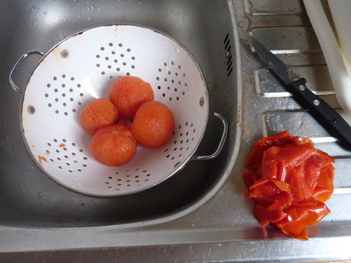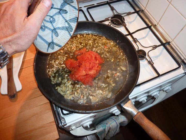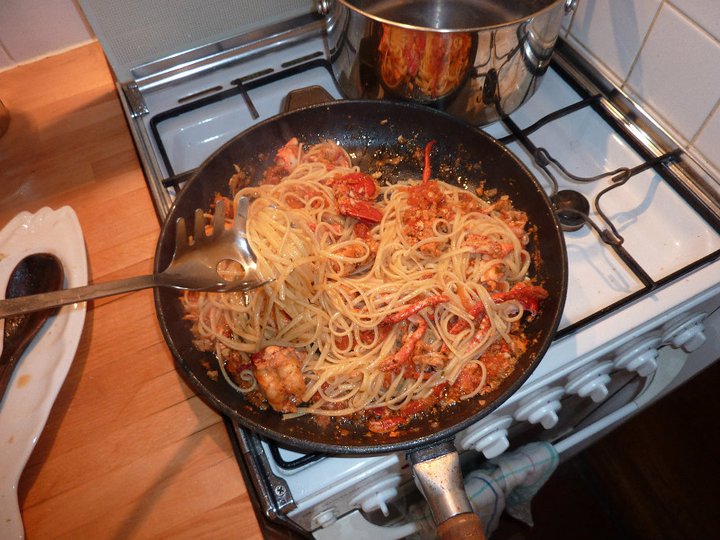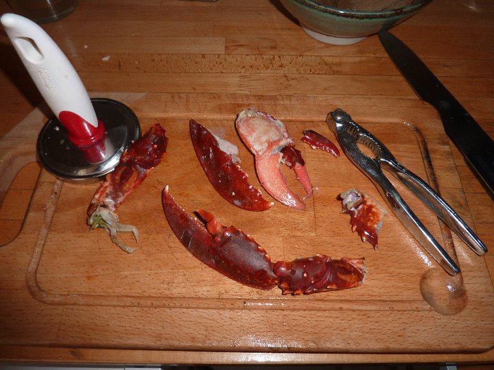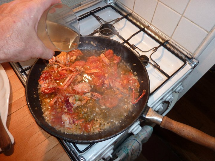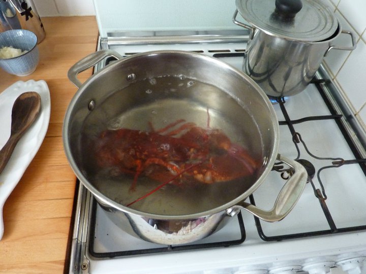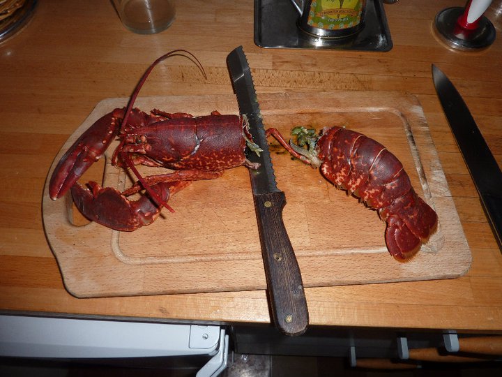 Mettez donc à réchauffer l’eau dans la casserole, et attendez qu’elle frémisse avant d’y jeter le crustacé. Pour un néophyte ce geste peu sembler cruel vis-à-vis de l’animal, mais c’est une question de secondes, et surtout les bruits que l’on entend – et qu’on croit souvent être des ‘cris’ – sont plutôt l’expansion des poches de gaz contenus dans sa carapace. Entretemps, hachez sur une planche en bois ail et oignons (ou échalotes) :Laissez le homard dans l’eau bouillante, jusqu’à quand il ait acquis une couleur rosée. Videz l’eau dans l’évier, posez le homard sur la planche, prenez-le entre vos mains et tournez-les l’une en avant et l’autre en arrière pour séparer la tête du corps. Ainsi faisant vous pourrez le vider de ses liquides internes, du corail et du foie (verdâtre). Si vous n’y arrivez pas, utilisez un gros couteau, comme sur la photo.Il y a des gens qui gardent ces éléments dans la recette, mais il faut savoir que le homard accumule et concentre les polluants marins, notamment dans le foie, à l’intérieur duquel on trouve aussi la tropomyosine, une protéine qui peut causer des allergies chez des sujets sensibles. Mieux vaut donc éviter. Ensuite, servez-vous d’un sécateur à volaille, ou d’un caisse-noix et d’un battoir pour vider la queue et les pinces de la chair. Elle est le met de choix de ce plat.Passez maintenant à la sauce. Fait bouillir pendant quelque minutes des tomates bien juteuses, après quoi pelez-les dans l’égouttoir. Coupez les tomates en petits dés et mettez-les de coté. Réchauffez l’huile (extra vierge) dans une poêle, et jettez-y le pilé d’ail et d’oignon (ou échalote). Dès qu’il aura blondi, ajoutez la pulpe de homard, le sel, quelques aromates et des épices (poivre, herbes de Provence, persil, piment rouge en poudre), et touillez pendant quelques minutes à feu vif. Ensuite, prenez la pulpe de la poêle et mettez-la de côté; mettez à sa place les tomates. Faites réduire (‘tirare’) la sauce à feu modéré. Ajoutez à nouveau la pulpe de homard, touillez, et ajoutez un verre de vin blanc sec. Continuez à faire cuire à feu modéré.Vous y êtes presque. Mettez l’eau à bouillir dans une grande casserole ou un fait-tout, et jetez-y les pâtes (je préfère les pâtes longues avec ce genre de plats, mais vous pouvez essayer d’autres formes, je ne me fâche pas).Le moment venu, videz l’eau dans l’évier, ajoutez les pâtes (‘al dente’, cela va sans dire) à la sauce, versez sur l’ensemble avec un peu d’huile et servez chaud à votre hôte.Comme vin je suggère un vin comme l’Alghero Torbato (de la Sardaigne). Alghero