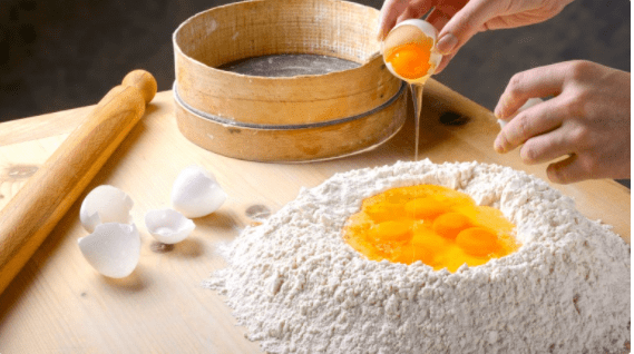 Faites une fontaine avec la farine sur une planche à pâtisserie (ou dans un grand bol), ajoutez les oeufs, le lait, une pincée de sel, et mélangez le tout jusqu’à que la pâte soit compacte. Laissez-la reposer une bonne quarantaine de minutes sous un chiffon.