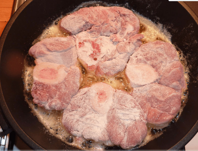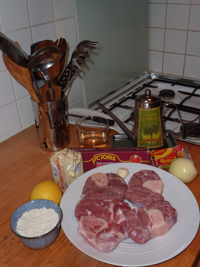 La qualité de votre osso buco dépend évidemment beaucoup de la viande. Demandez à votre boucher du jarret de veau : la partie inférieure de la patte arrière de la bête est tendre et très riche en moelle. Durant la cuisson, le tissu fondera, facilitant le glaçage de la viande et la formation de la sauce. On y associe de la farine, du sel, du poivre, un gros oignon, du beurre, un peu d’huile (quand même, on est toujours en Italie…), un verre de vin blanc sec, un cube de bouillon de veau, une gousse d’ail, le zeste d’un demi citron et un peu de persil. Ces trois dernières éléments, hachés, constitueront la ‘gremolata‘, le pilé qui relèvera le goût du plat.