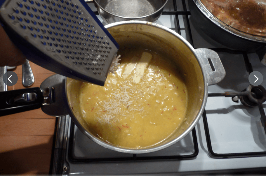 Venons-en maintenant à la préparation du risotto au safran. La légende veut que ses origines remontent à la fin du XVe siècle. A l’époque, un maître verrier (Valery des Flandres), qui travaillait sur le chantier du Dôme de Milan, aurait décidé de donner plus de goût à son assiette de riz, en ajoutant un des ingrédients utilisés pour colorer les vitraux, le safran.