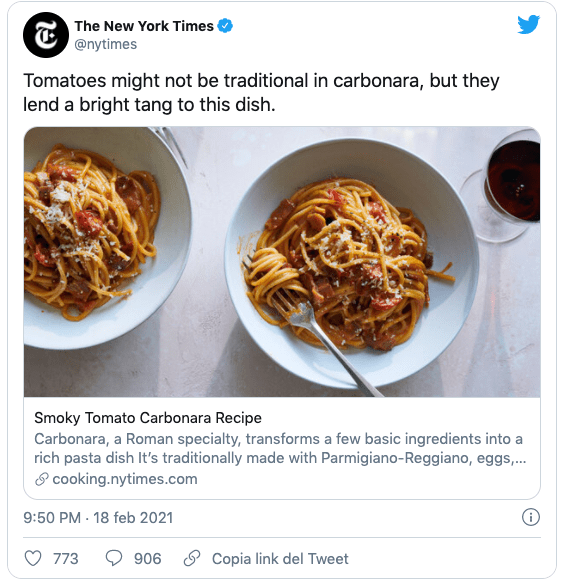 Une bloggeuse américaine – Kay Chun – apparement experte de cuisine italienne (à la façon des USA), a publié un post sur le NYTimes, à propos d’une carbonara avec bacon et sauce tomate. Je passe sur l’utilisation du parmesan (surement produit en Amérique) à la place du pecorino et sur le bacon, mais la sauce tomate qui – selon la Chun – donne « un goût brillant » à l’ensemble…vous comprendrez qu’on est pas encore sorti de l’auberge. Mais alors là pas du tout !