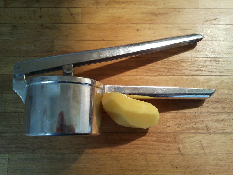 Entre temps (parfois j’aimerais avoir quatre bras comme la déesse Kali) vous aurez déjà lancé la préparation de la garniture, c’est-à-dire une purée de pommes de terres. Faites d’abord bouillir les patates; passez-les ensuite au presse purée, remettez-les dans une casserole avec une pincée de sel et quelques morceaux de beurre, et touillez en mélangeant avec du lait.