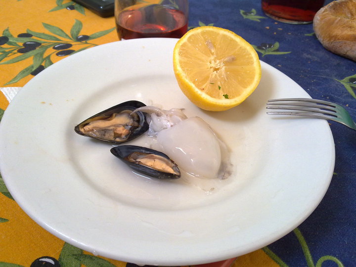 L’histoire remonte aux années 50, mais encore de nos jours les gens du port de Molfetta sont respectés par les ‘citadins’ de Bari comme des êtres fabuleux, mi-hommes mi-poissons. Partout dans les Pouilles, on mange tous les produits de la mer cuits ou crus. C’est un peu une version italienne des sushi japonais. Sauf que nous on fait moins dans la dentelle. Commençons avec les hors d’oeuvres. Les petites sèches (Sepia oficinalis) qu’on appelle allievi sont les plus prisées. A Bari, on a l’habitude d’en ôter l’oeil, les poches d’encre et l’os interne, avant de les mettre dans de l’eau de mer avec des glaçons. Le moment venu, on les appréciera seulement avec deux gouttes de citron… et quelques copains d’aventure, comme des moules ou autres mollusques. Crus eux aussi, cela va sans dire.Deuxième hors d’oeuvre à disposition des palais plus tendres : les petites crevettes (Palaemon xiphias ou serratus), pêchées non loin de côtes. Décortiquées de la tête et de leur carapace, elles sont avalées crues avec toujours un filet de citron.