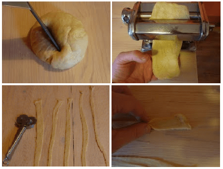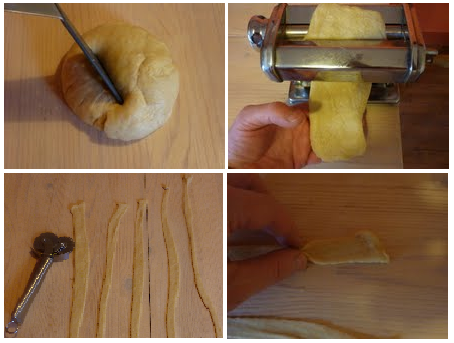 C’est le moment d’utiliser la machine à pâtes. Coupez un morceau de la boule, aplatissez-le à la main, passez-le à la machine jusqu’à obtenir une feuille pas trop fine, que vous couperez en bandes à l’aide d’une roue dentée (pour les cartellate). Après quoi il suffira de presser la bande entre les doigts à intervalles réguliers, et de l’enrouler sur elle-même, au fin d’obtenir la rose dont on a parlé plus haut. Pour le chiacchiere, c’est plus facile : on utilise toujours la machine à pâte, mais après il suffit de créer des rectangles, qu’il faudra entailler une ou deux fois avec un couteau (ça aide la cuisson).