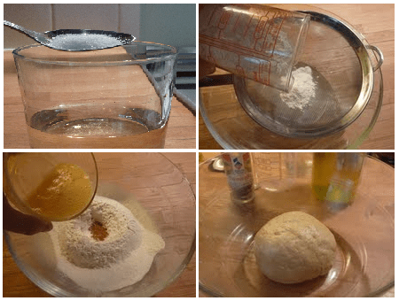 Faites dissoudre une pincée de sel dans un verre de vin blanc et tamisez de la farine dans un grand bol. Créez une fontaine, ajoutez les oeufs battus, la cannelle, l’huile, des zestes de citron, le beurre, la levure de boulanger et le vin. Pétrissez à la main, jusqu’à obtenir une boule homogène, qu’il faudra laisser reposer au moins deux heures.