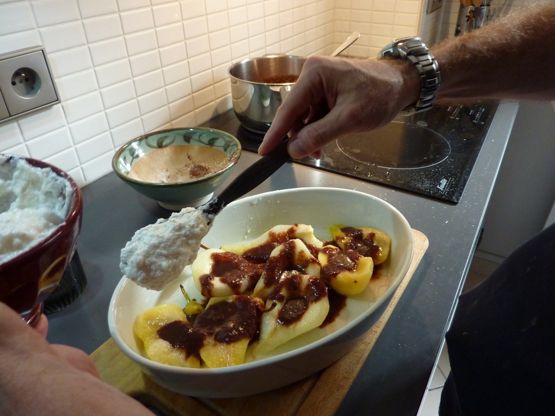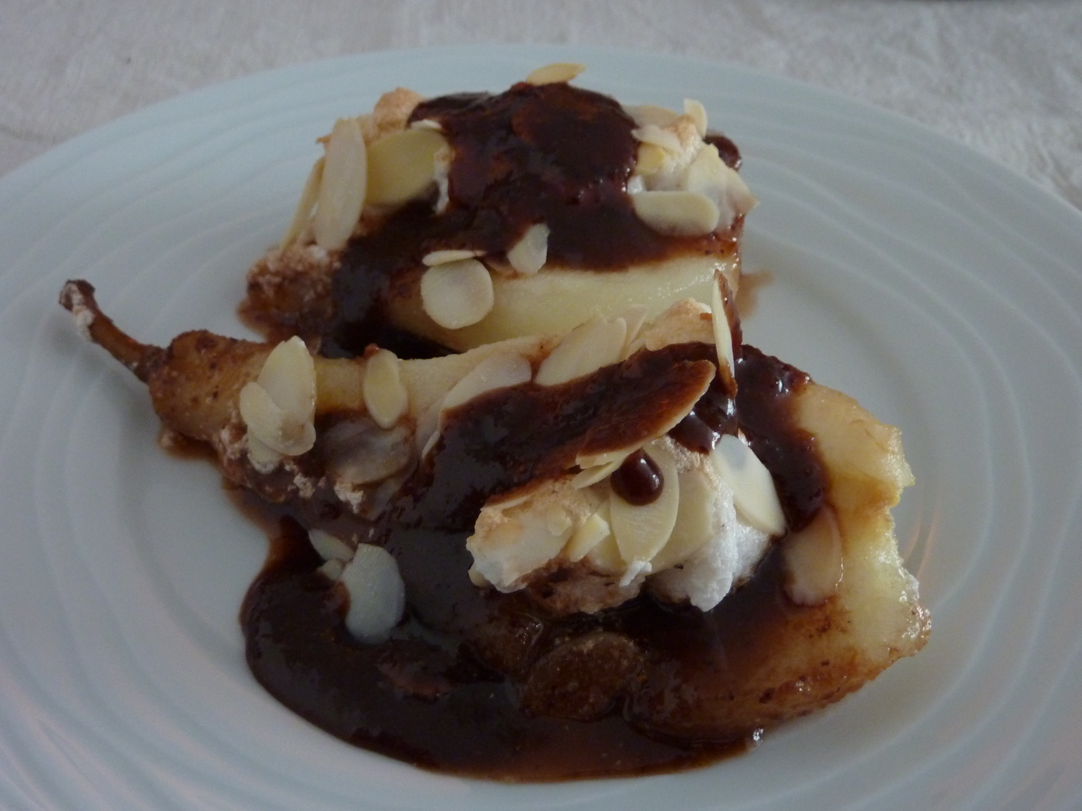 Dernier détail : les poires s’accompagnent, en plus de la crème de noisettes, d’une meringue « italienne ». N’ayez crainte, elle est très facile à réaliser. Il faut monter en neige deux oeufs. Si vous êtes pressés, utilisez le fouet électrique. Après quoi, incorporez du sucre et touillez très lentement. Restez zen, comme toujours…