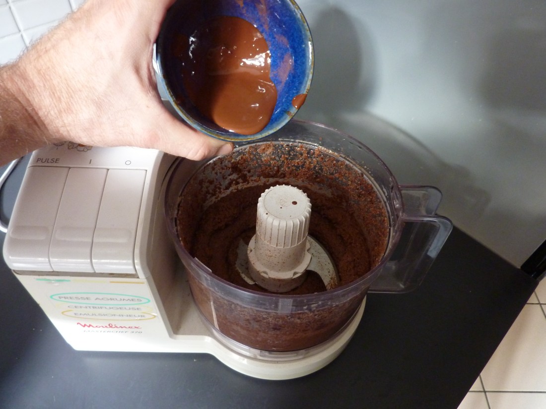 Laissez tourner la machine, et entre temps ajoutez de l’huile de tournesol, du sucre, du cacao amer en poudre, deux pincées de sel fin, et du lait (d’amande, ou de vache. Moi j’ai opté pour le seconde). Et enfin, quelques carrés de chocolat noir que vous ferez fondre dans un ramequin avant de l’ajouter à l’ensemble.