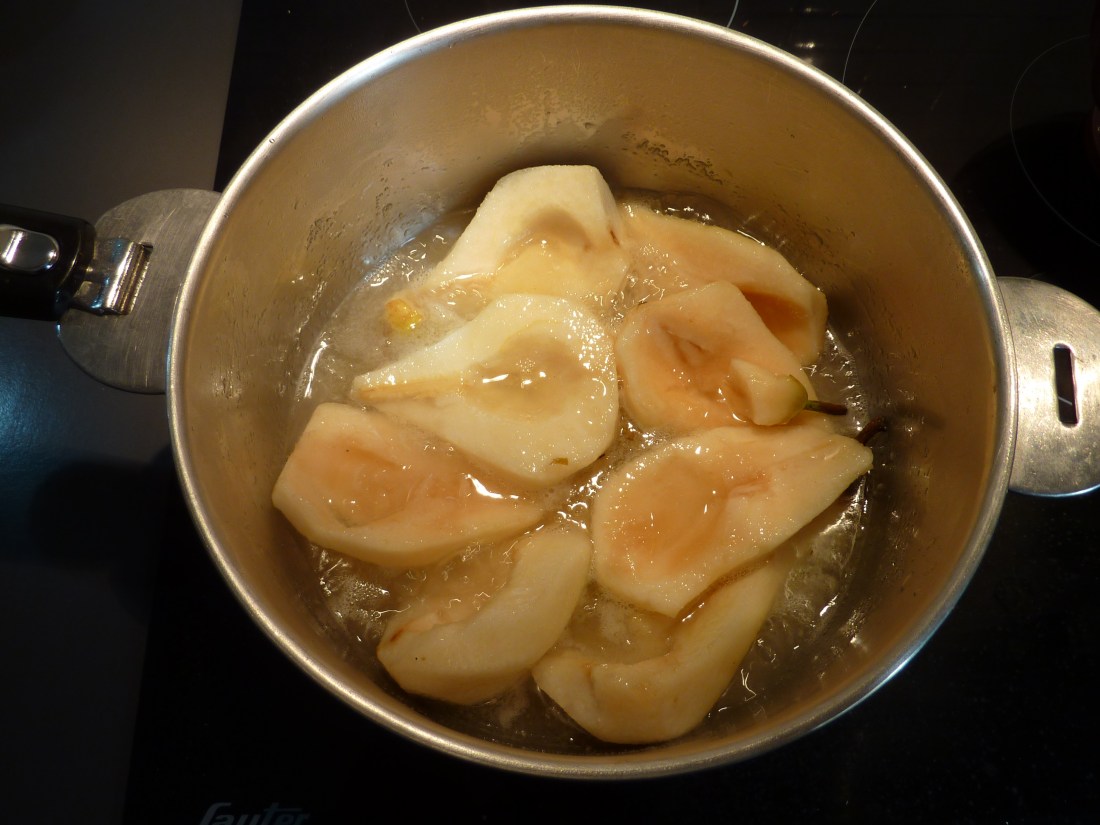 Pour le sirop = 4 poires (Williams, Conférence); 3 cuillères d’eau; 50 gr. de sucre, le jus d’un citron