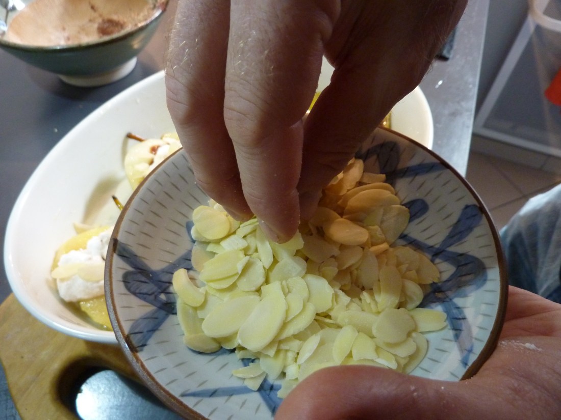 Et ajoutez délicatement des amandes effilées. Allumez le four, faites chauffer à une température de 180°, introduisez le plat et attendez dix minutes.