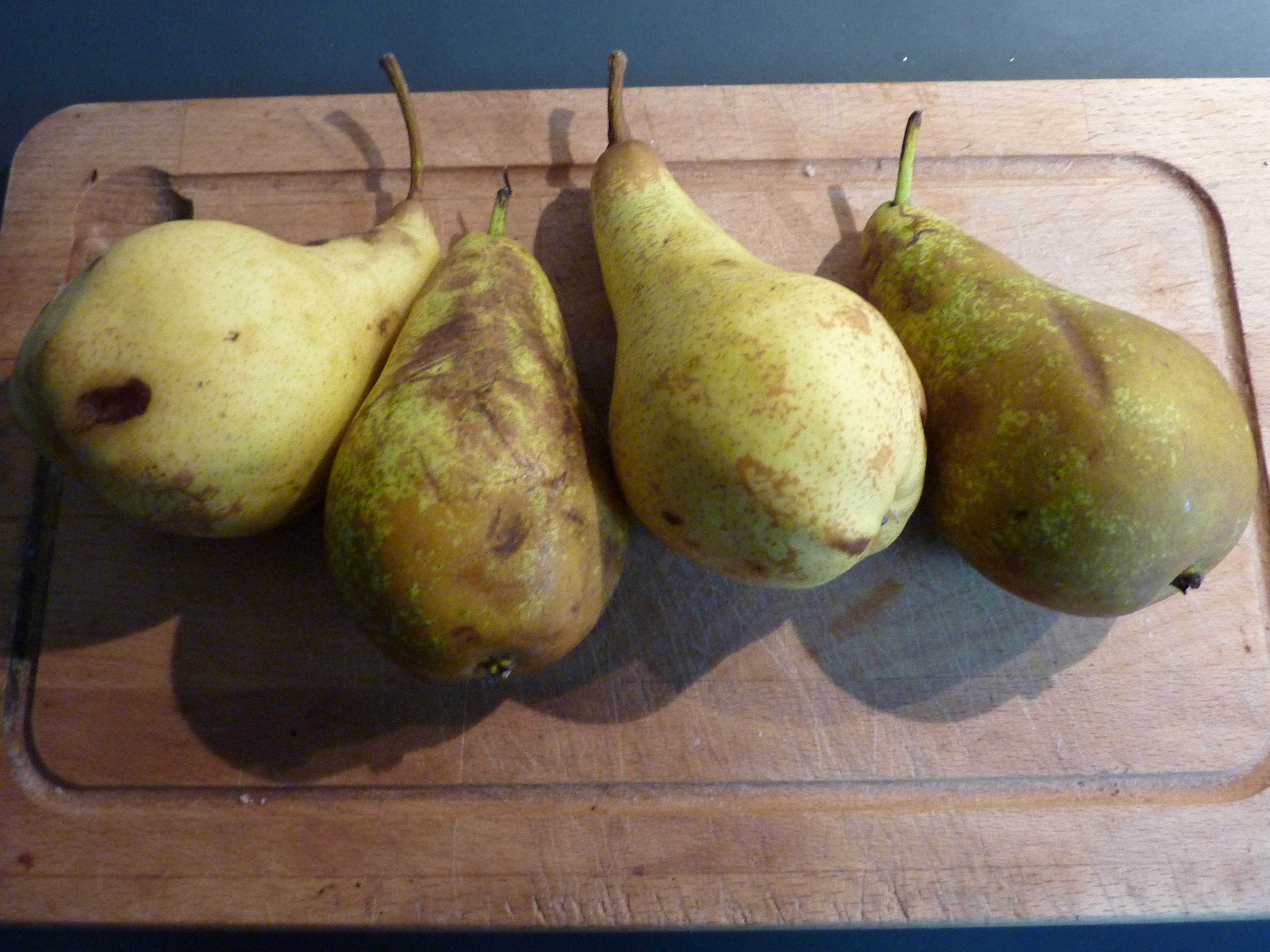 A savoir les poires. Préférablement à la chaire ferme. Dans le doute, j’ai choisi deux Conférence et deux Williams.
