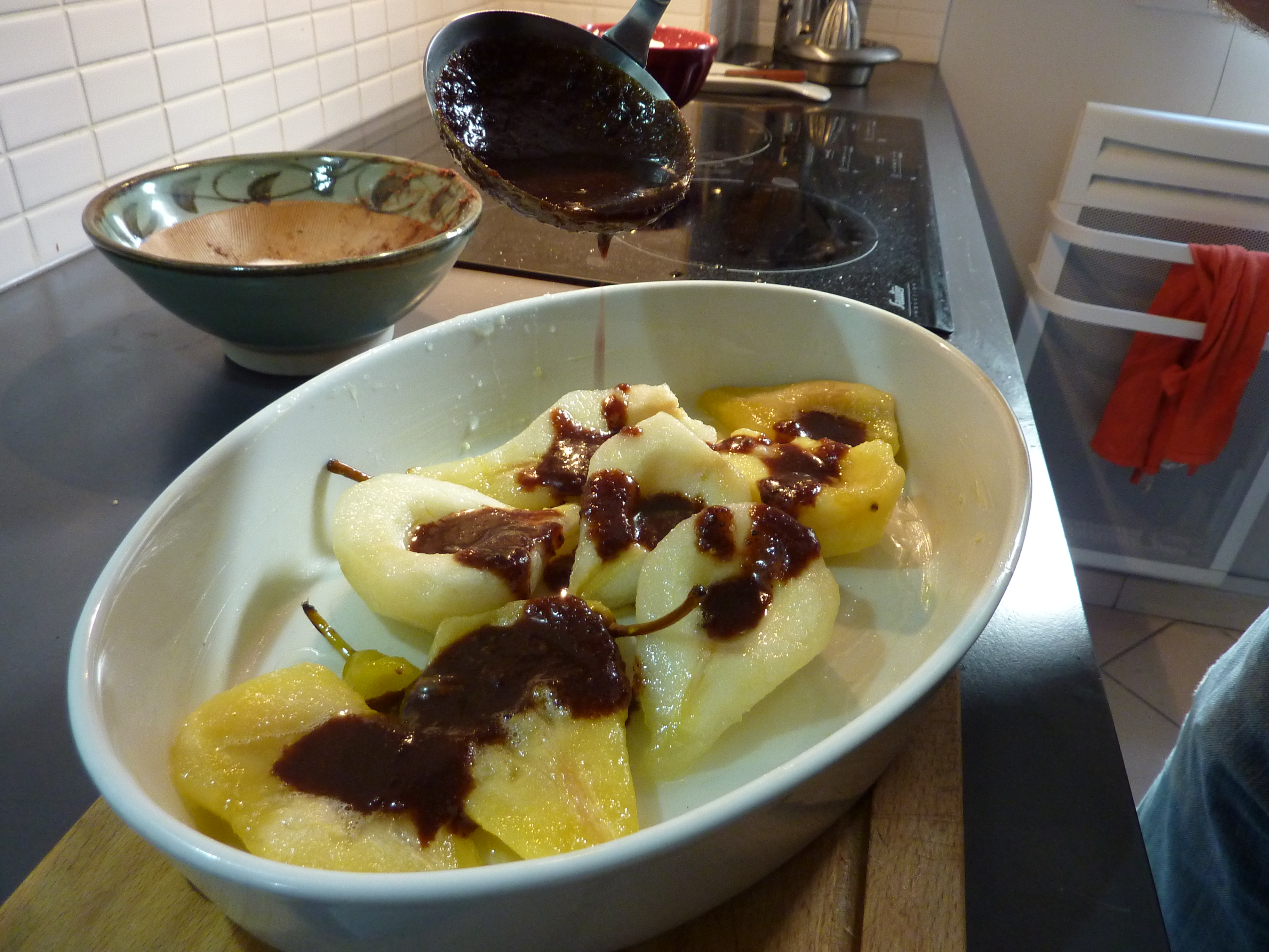 On y est presque. Versez le sirop mélangé à la crème sur les poires.