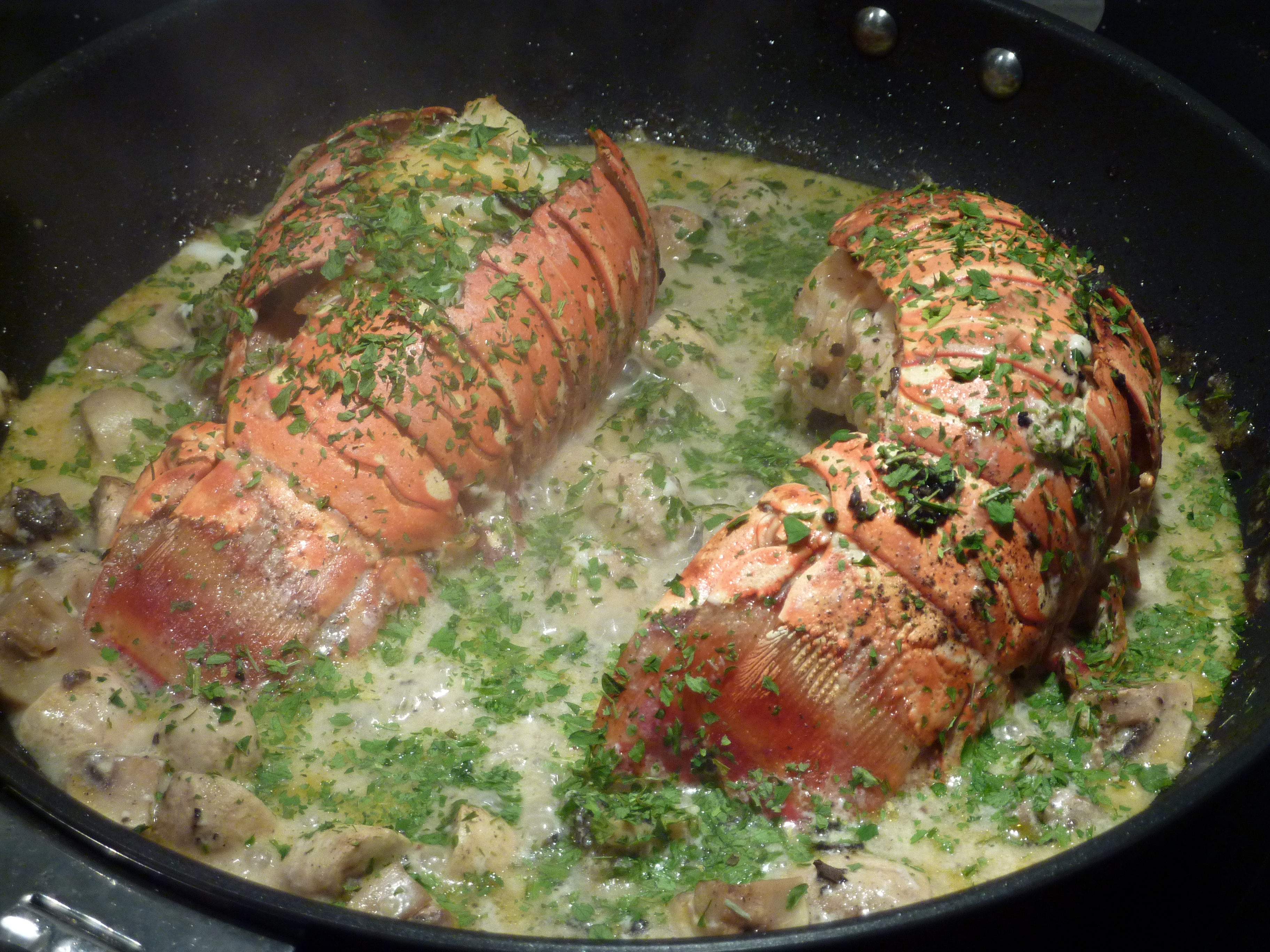 4 queues de langouste; 50 gr. de truffe; 200 ml de champagne; 100 de champignons de Paris; 50 cl. de crème fleurette, huile, sel, poivre, persil haché.