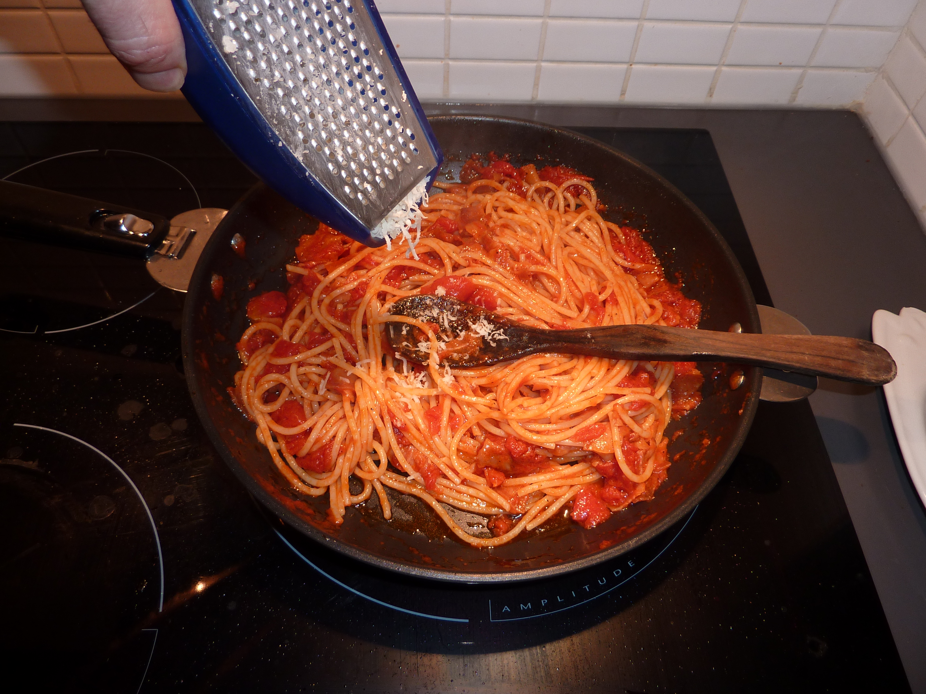 En attendant, râpez le fromage et mettez à chauffer l’eau pour les pâtes. Pour des spaghetti al dente, il faut calculer normalement 11-12 minutes (cela dépend de la marque).