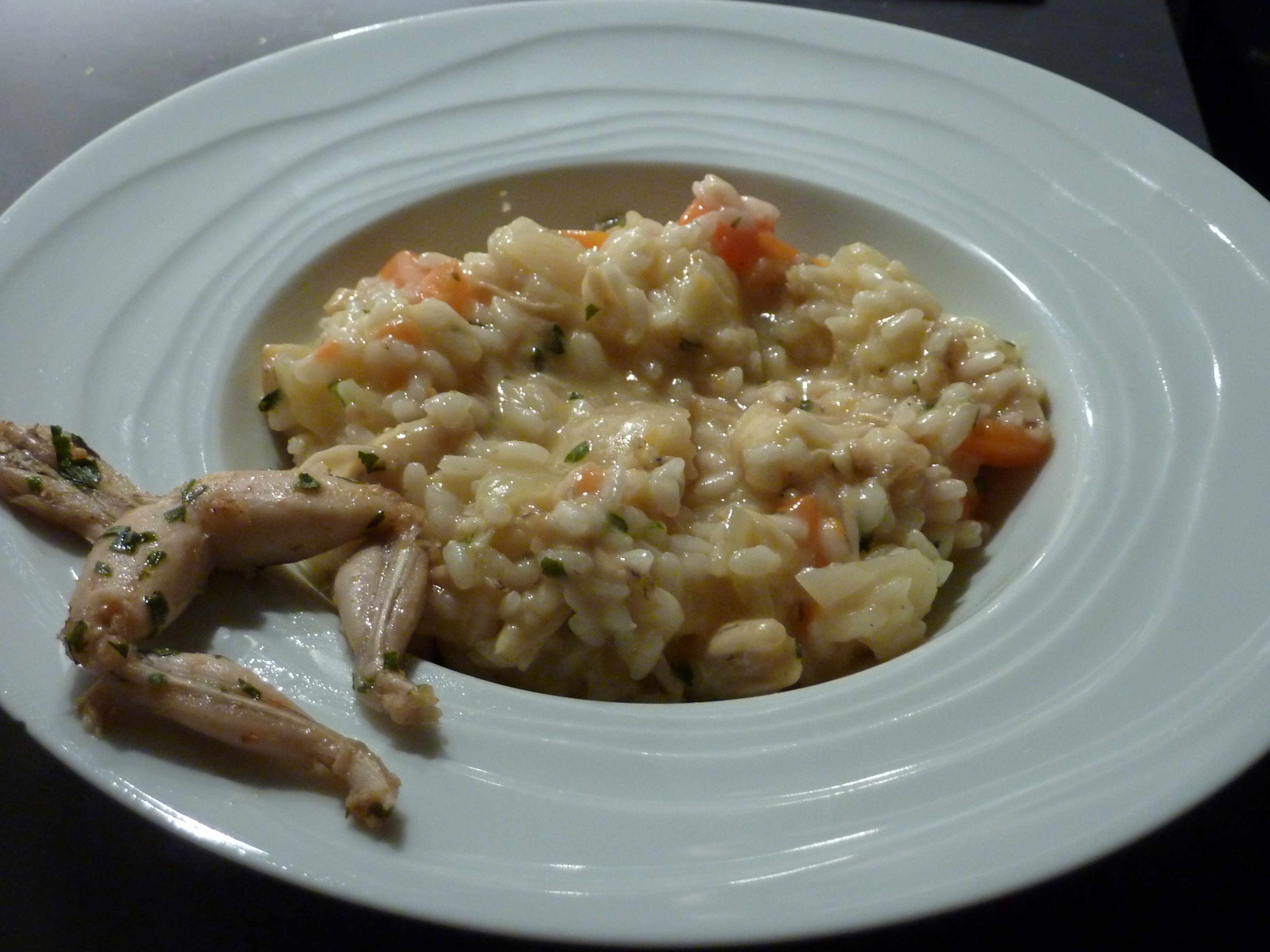 Le risotto con le rane est l’une des recettes traditionnelles de l’Italie septentrionale, des plaines fluviales du Piémont, de la Lombardie et de la Vénétie, jusqu’à l’Emilie-Romagne marécageuse. Ces terres, depuis toujours à forte vocation agricole, étaient jadis très pauvres, comme l’illustre le film Riso Amaro (1949), avec Silvana Mangano qui joue le rôle d’une mondina, ouvrière saisonnière dont la pénible tâche est de retirer les mauvaises herbes qui poussent dans les rizières. Aujourd’hui le travail est mécanisé, et même les grenouilles destinées à l’alimentation sont élevées dans des bassins (sauf si vous avez la chance de connaître un chasseur expérimenté…). Moi j’en ai mangé récemment de très bonnes, en entrée, dans le deep Quercy (entre le Lot et l’Aveyron), et j’ai décidé de tenter l’expérience, mais à l’italienne et à ma façon.