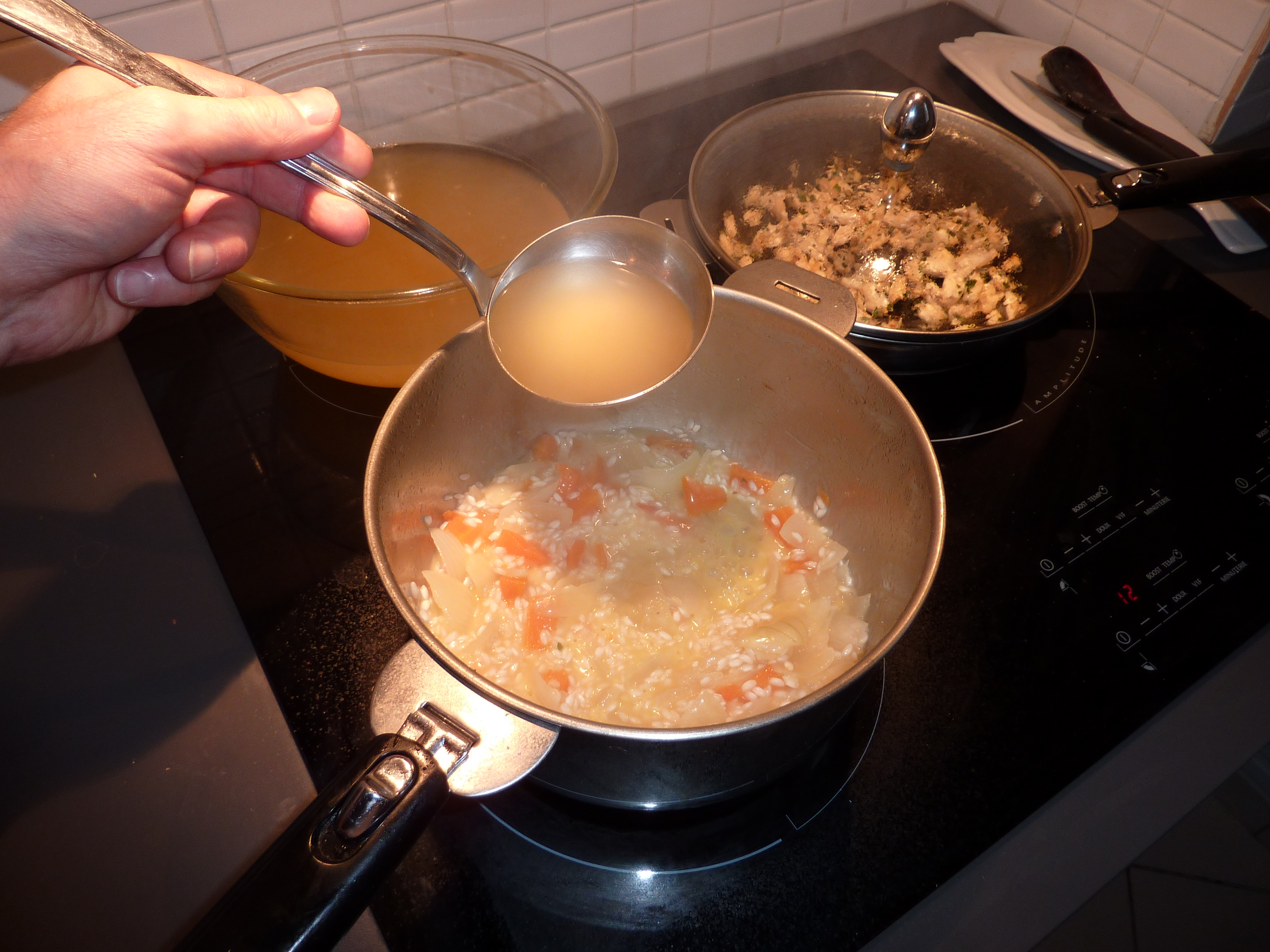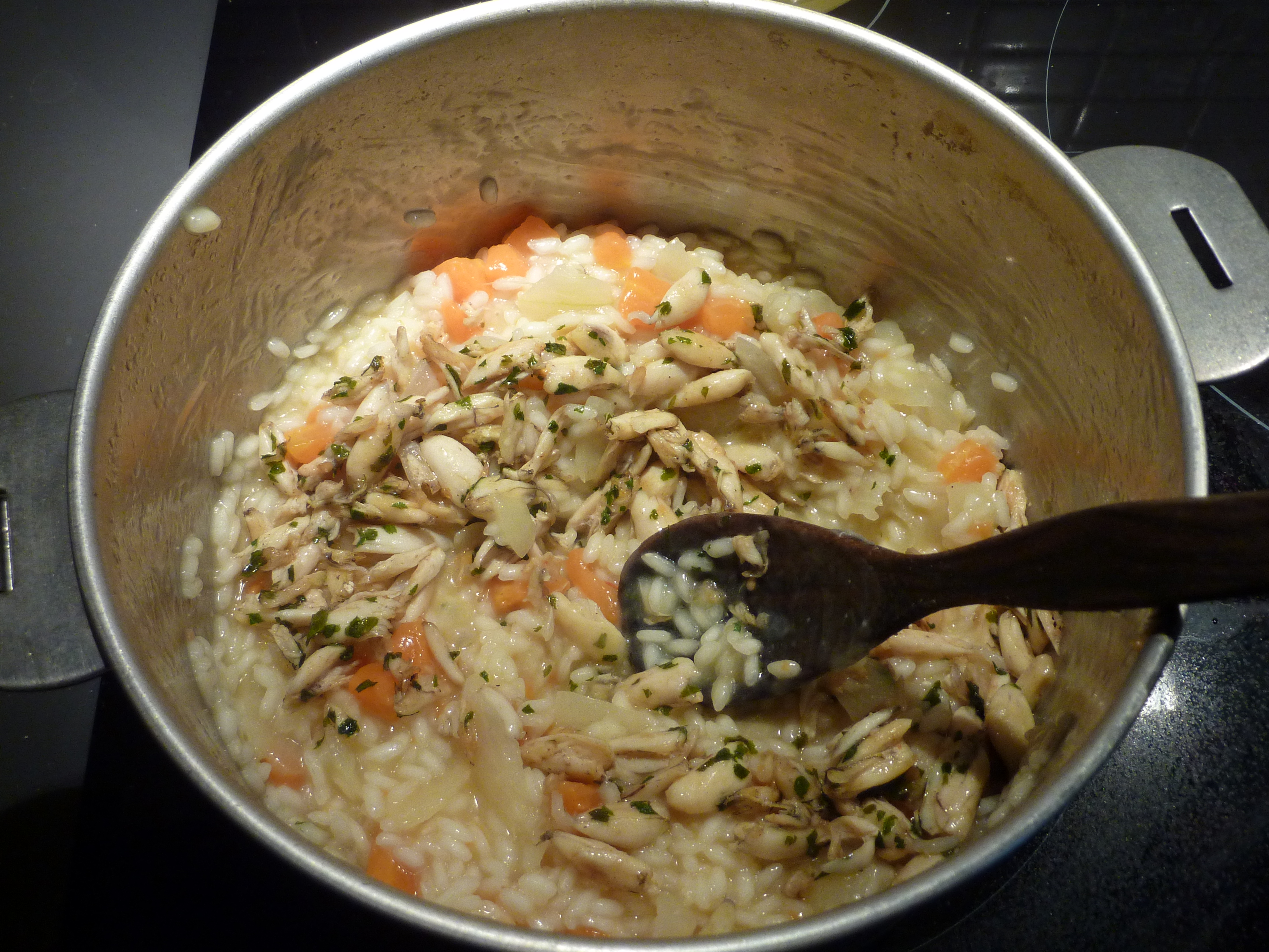 Passons au risotto. J’ai fait dissoudre dans une casserole un morceau de beurre, j’ai ajouté un oignon et un carotte émincées finement, et ensuite le riz Carnaroli, que j’ai toasté un court moment avec un peu d’huile. Après quoi j’ai ajouté un verre de vin blanc. J’ai attendu qu’il évapore, et toujours tout en touillant j’ai ajouté, au fur et à mesure, des louches du bouillon.