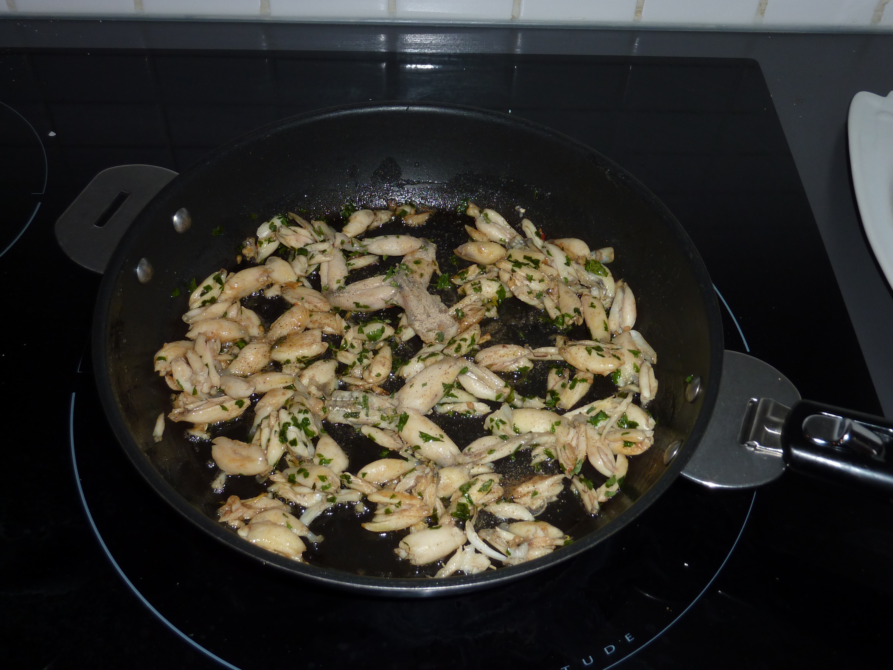 Une fois cette opération terminée, j’ai prélevé les cuisses du bouillon pour les désosser. Ensuite j’ai fait frire une gousse d’ail dans une poêle avec un peu de beurre et quelques gouttes d’huile. Lorsque l’ail est devenu doré, je l’ai enlevé et j’ai ajouté les cuisses. J’ai salé, poivré, parsemé de persil haché et laissé cuire à feu très doux.