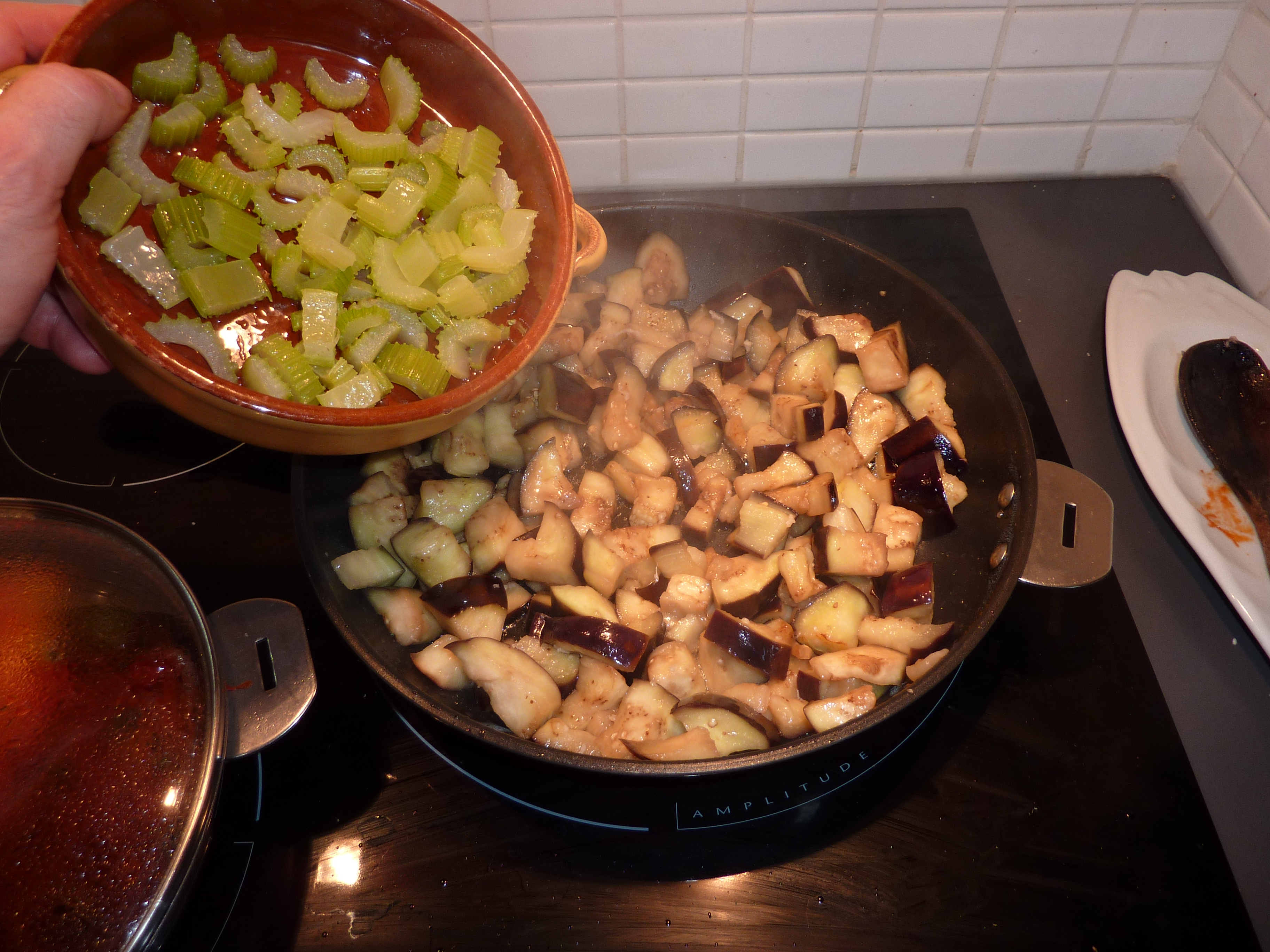 Vers la fin de la cuisson de la sauce, mettez les aubergines à frire dans une autre poêle à feu doux. Dès qu’elles commencent à dorer, ajoutez d’abord le céleri…