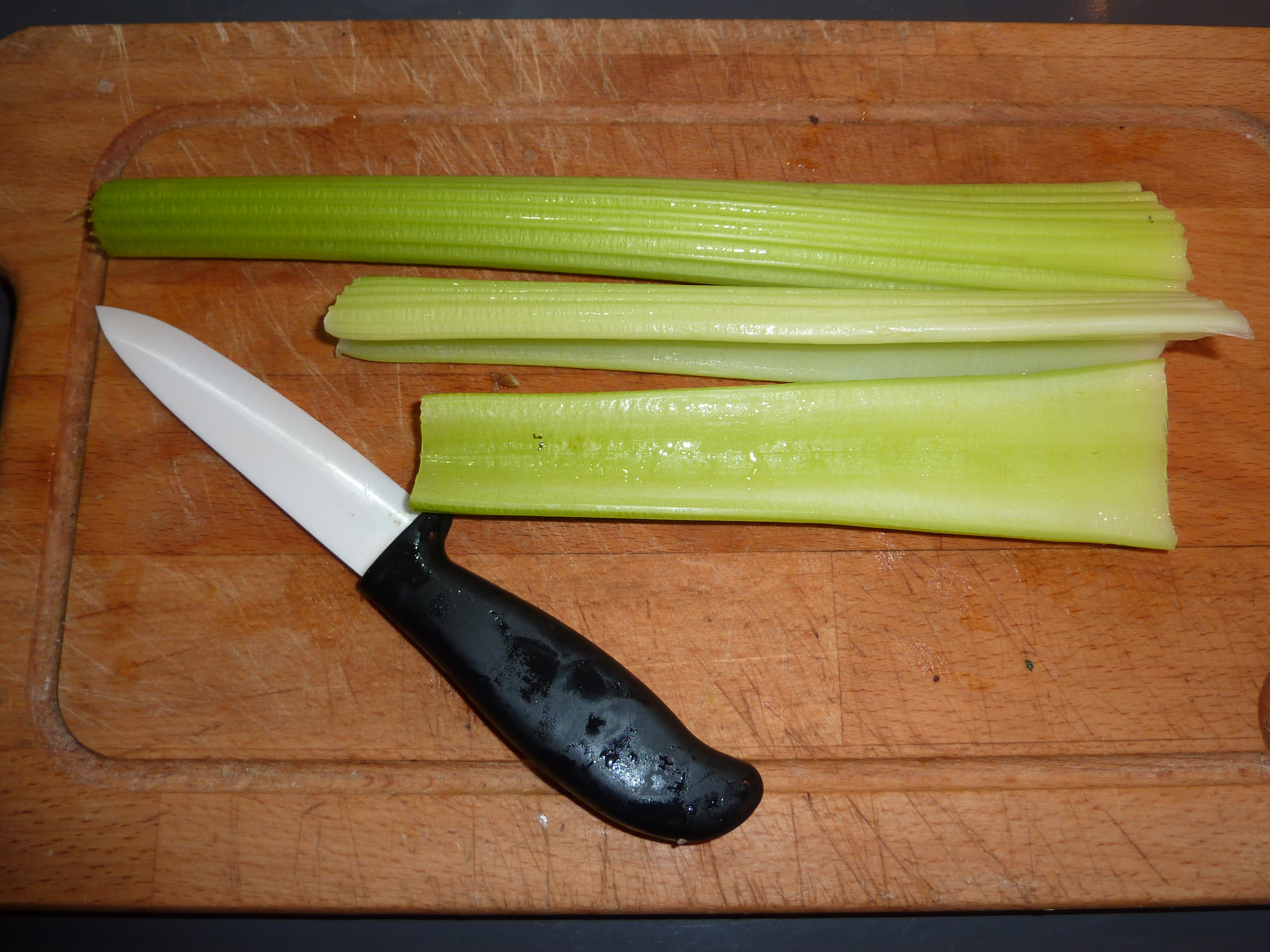 Entre temps, coupez en petits morceaux le céleri, et mettez-le à bouillir dans de l’eau frémissante pendant cinq minutes, avant de l’égoutter.