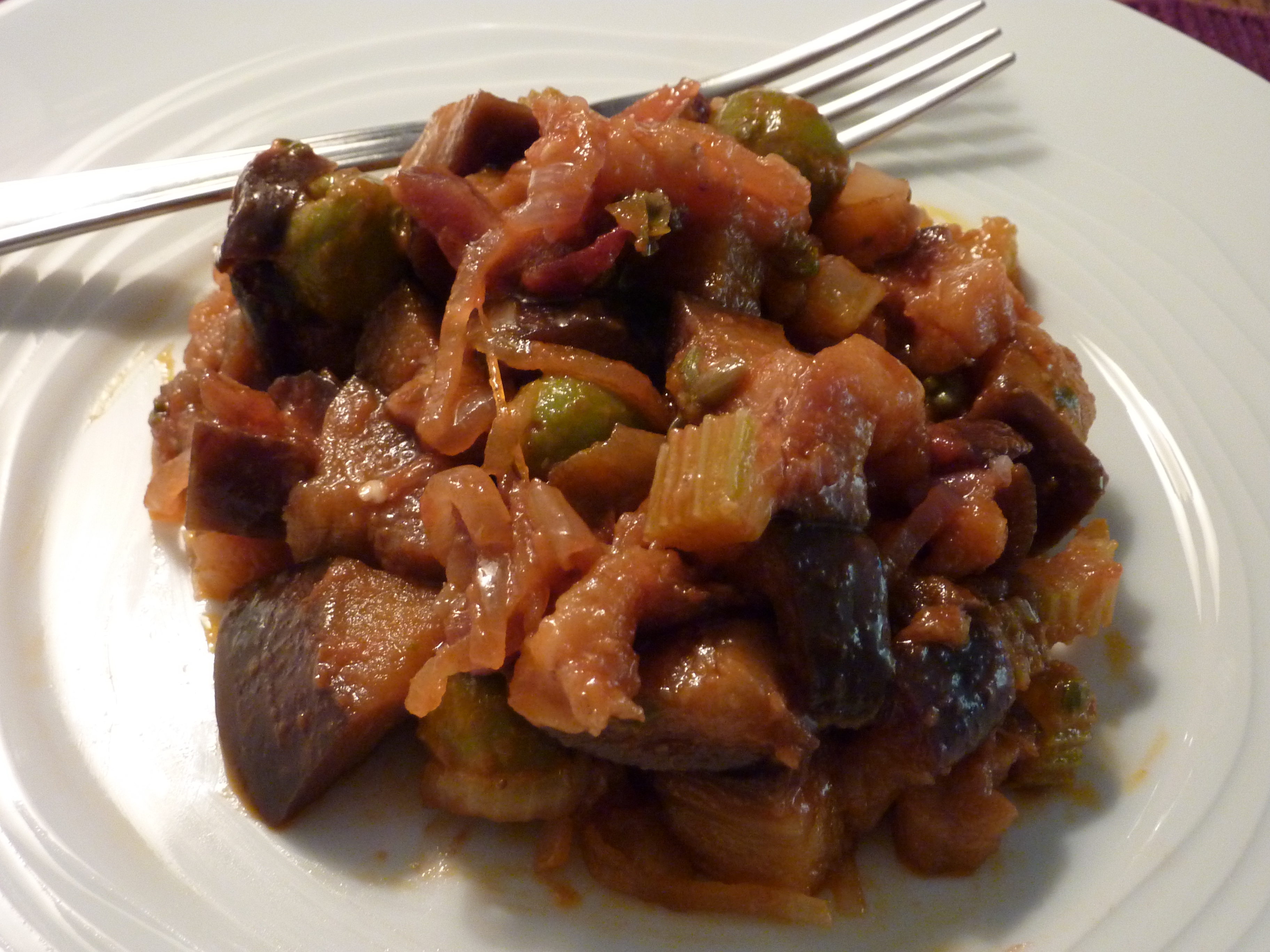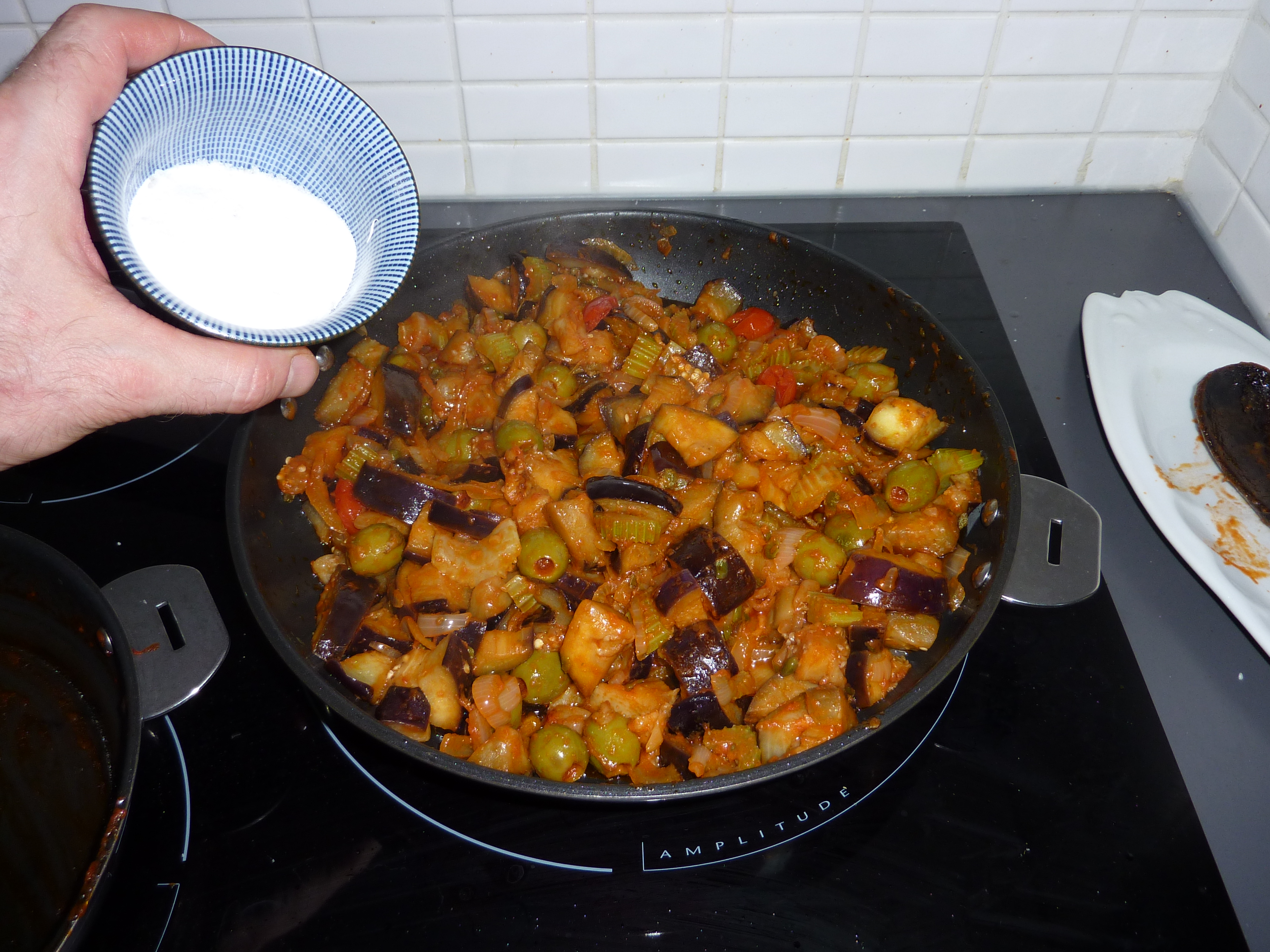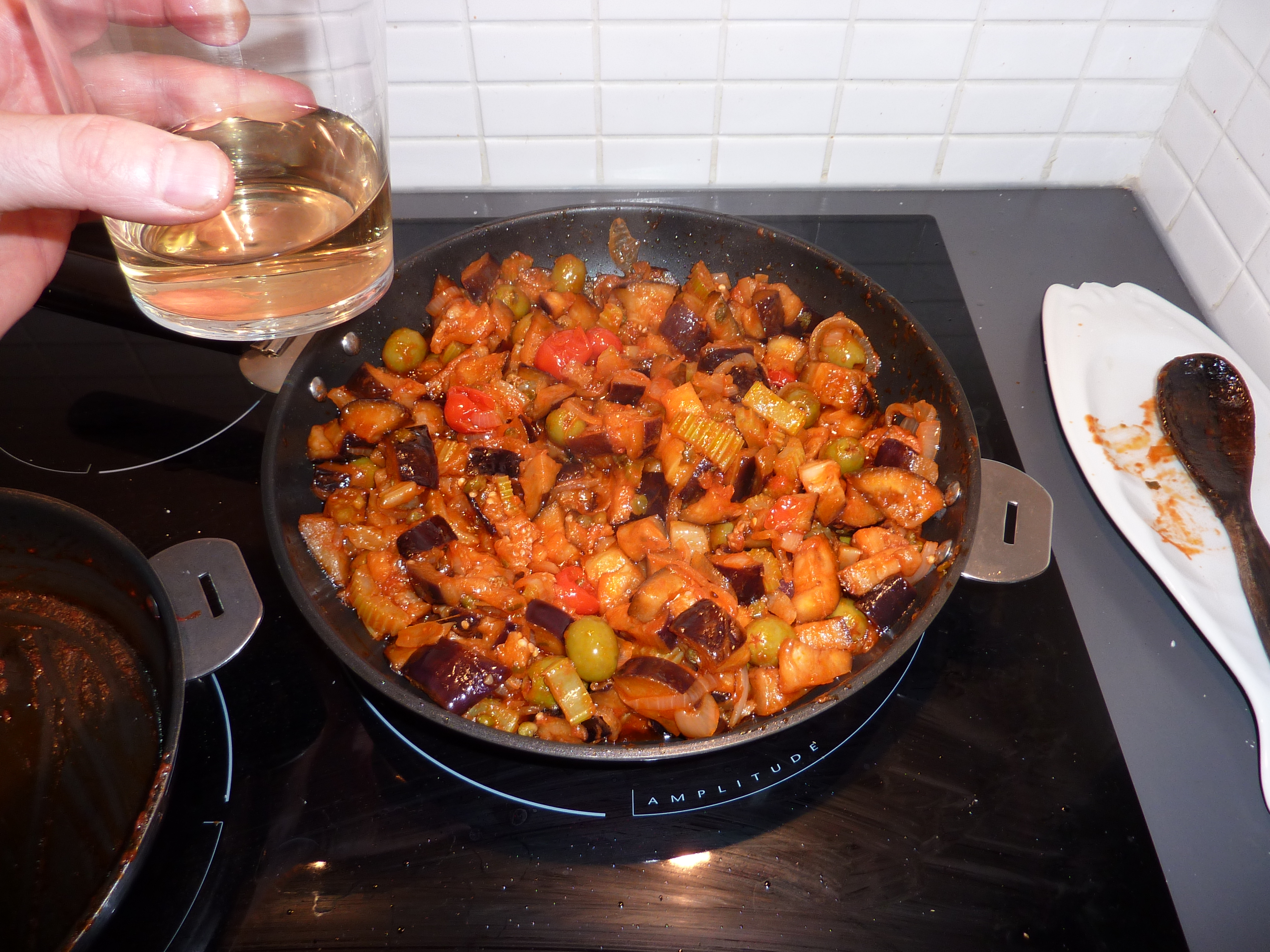 et finalement un peu de vinaigre (attention à ne pas exagérer. Cela risque de tout gâcher). Touillez à l’aide d’une cuillère en bois, couvrez, et attendez que l’odeur de vinaigre ait disparu. Alors la caponata sera prête pour être servie. Chaude, tout de suite, ou froide, le lendemain.