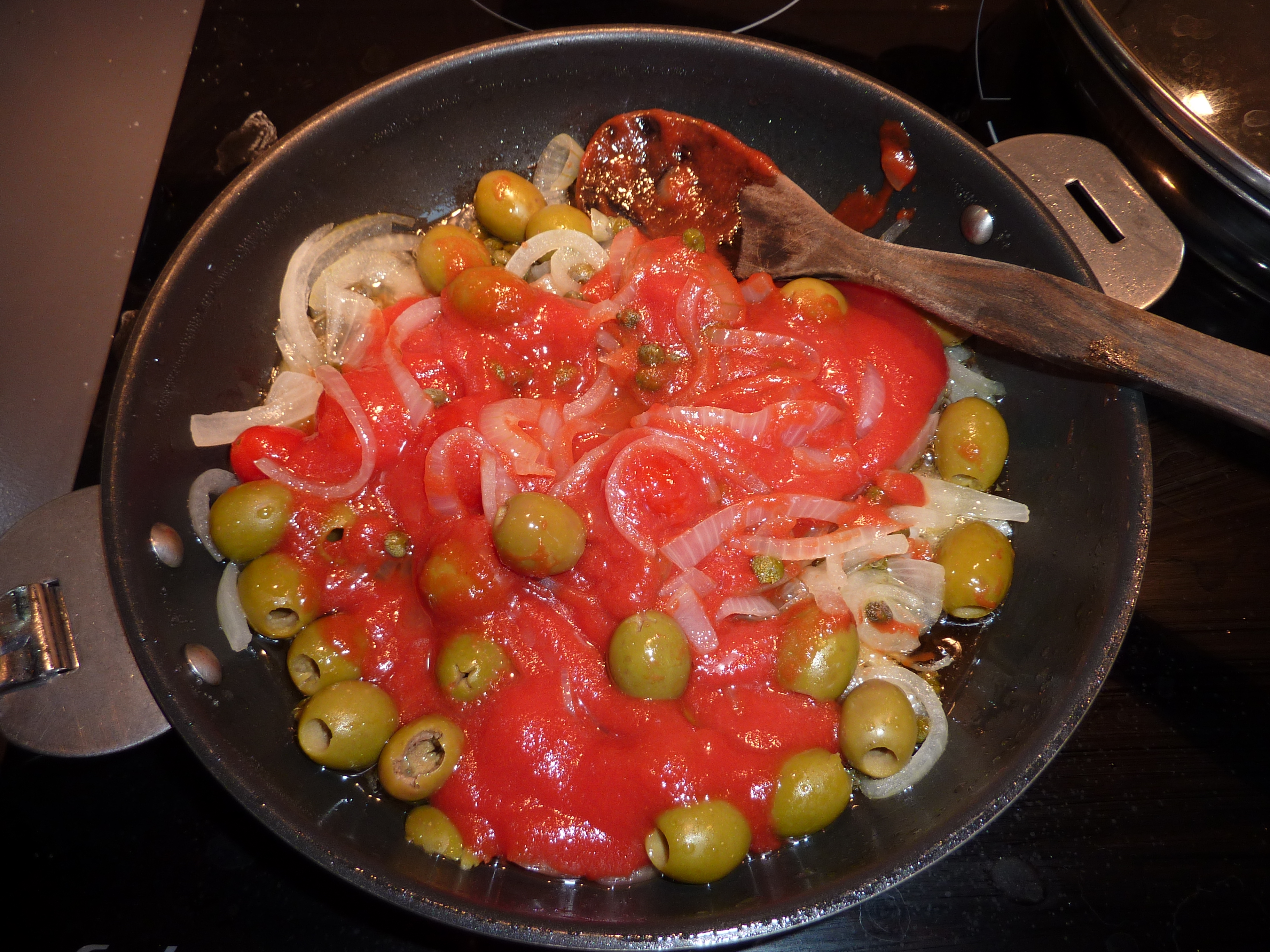 Faites frire les oignons dans un peu d’huile, et ajoutez les olives, les câpres, les tomates, avec un pincée de sel. Laissez mijoter à feu doux pendant une vingtaine de minutes.