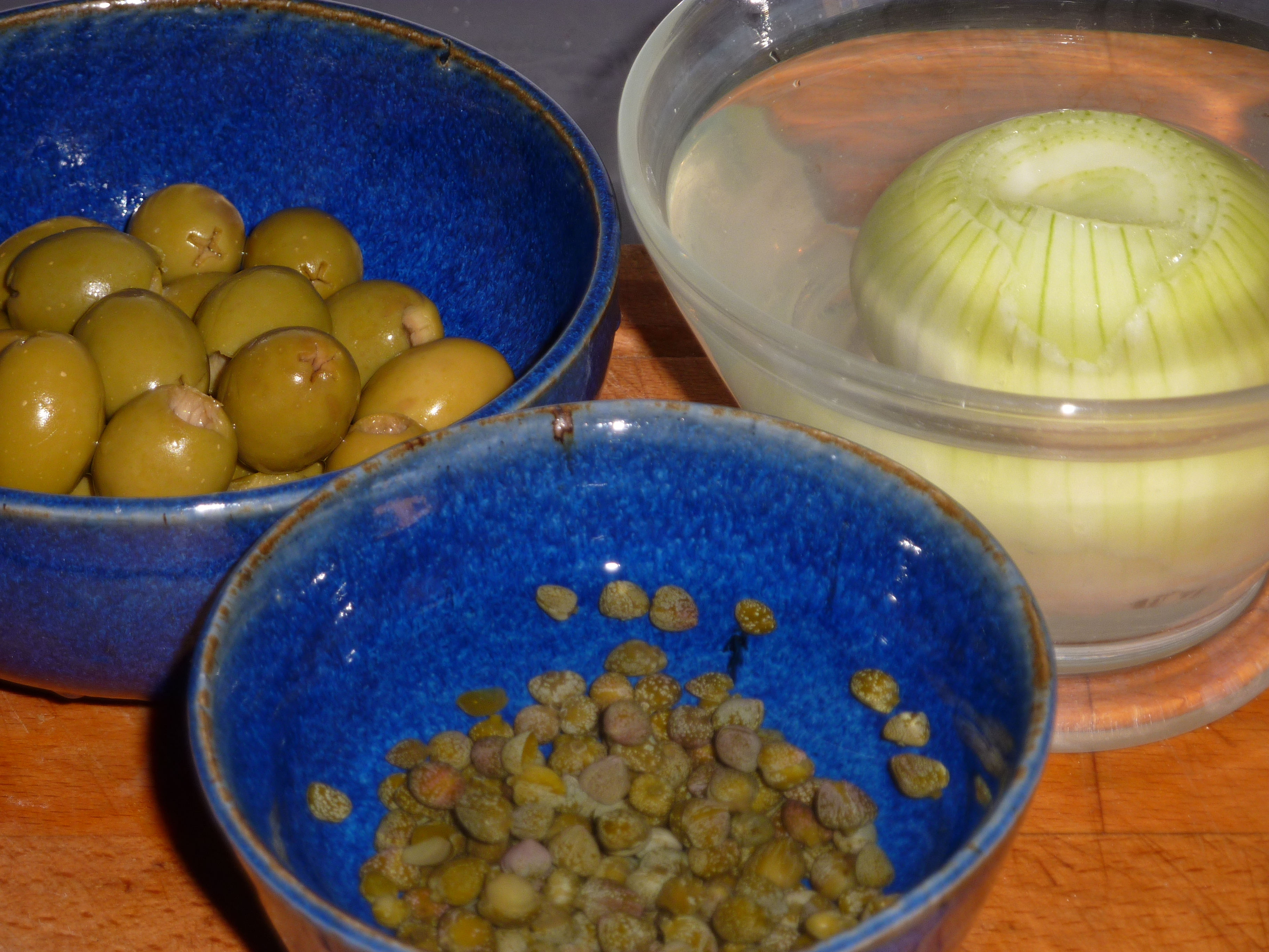 Préparez des olives vertes, des câpres (une poignée par personne, à dessaler), et deux oignons (avant de les couper, mettez-les dans l’eau une dizaine de minutes, cela vous évitera de pleurer au moment de les couper en fines rondelles).