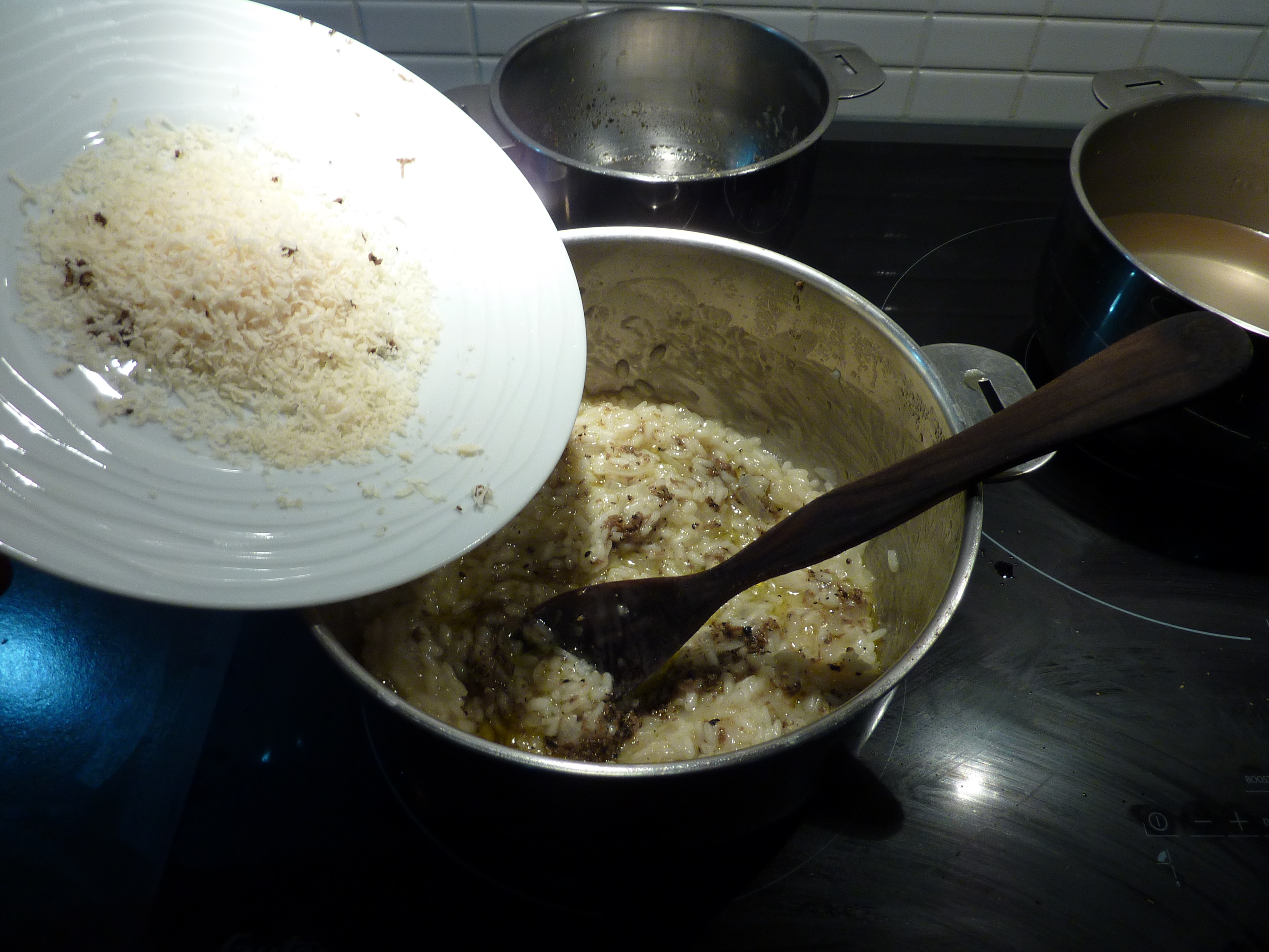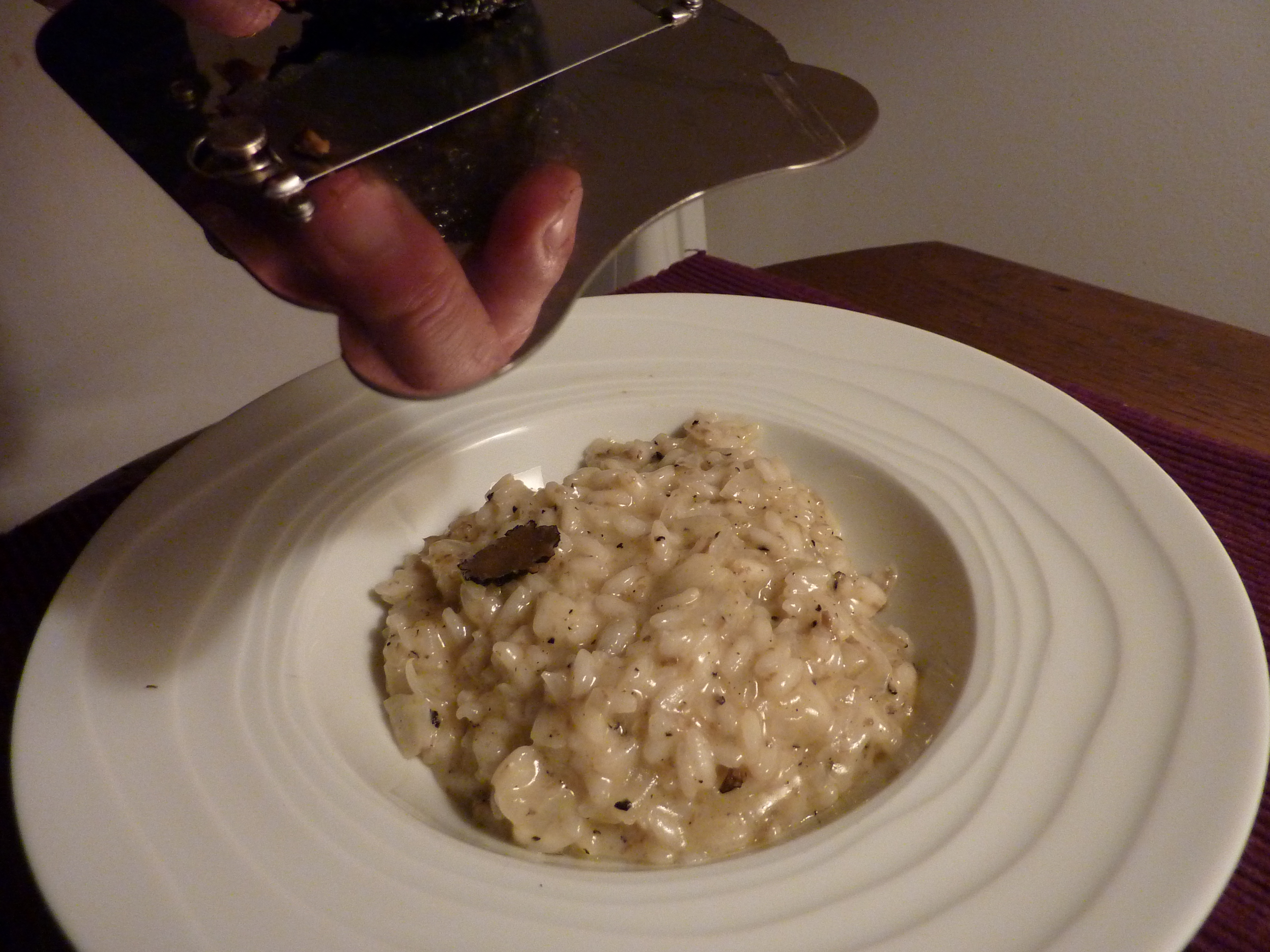 J’ai décidé d’exécuter une recette de risotto, à vrais dire plus piémontaise que ombrienne. Préparez donc un demi verre de vin blanc, du riz, un oignon blanc, du beurre, du fromage Parmigiano, de l’huile extra vierge d’olive, sel, poivre, et bien sûr, une truffe (avec une râpe et une mandoline).