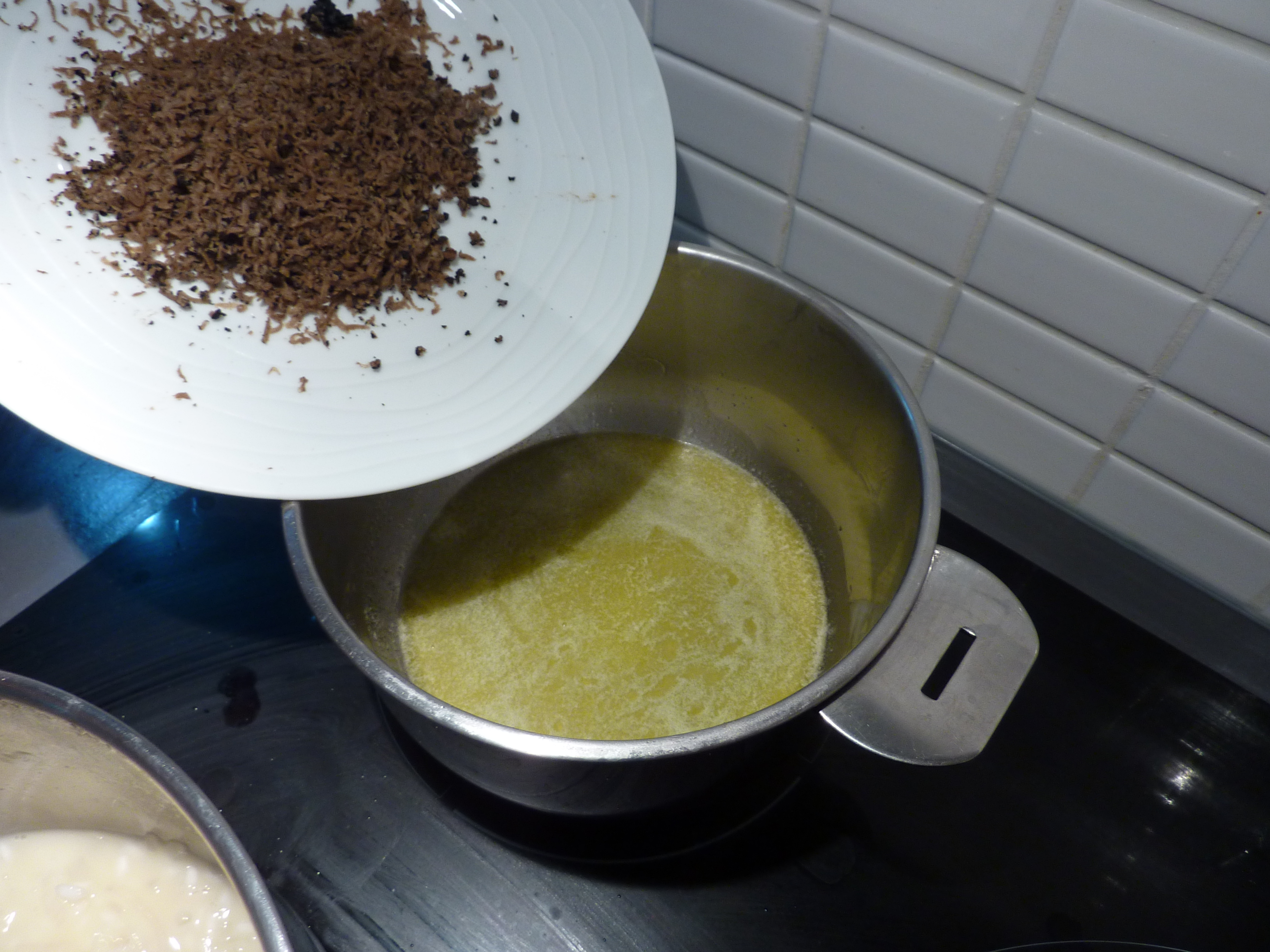 Vers les trois quarts du temps de cuisson du riz, mettez dans une petite casserole un morceau de beurre et de l’huile. Attendez que le beurre soit devenu liquide, et ajoutez la truffe râpée. Touillez quelques instants, et laissez-la au chaud (feu éteint, ou flamme au minimum).