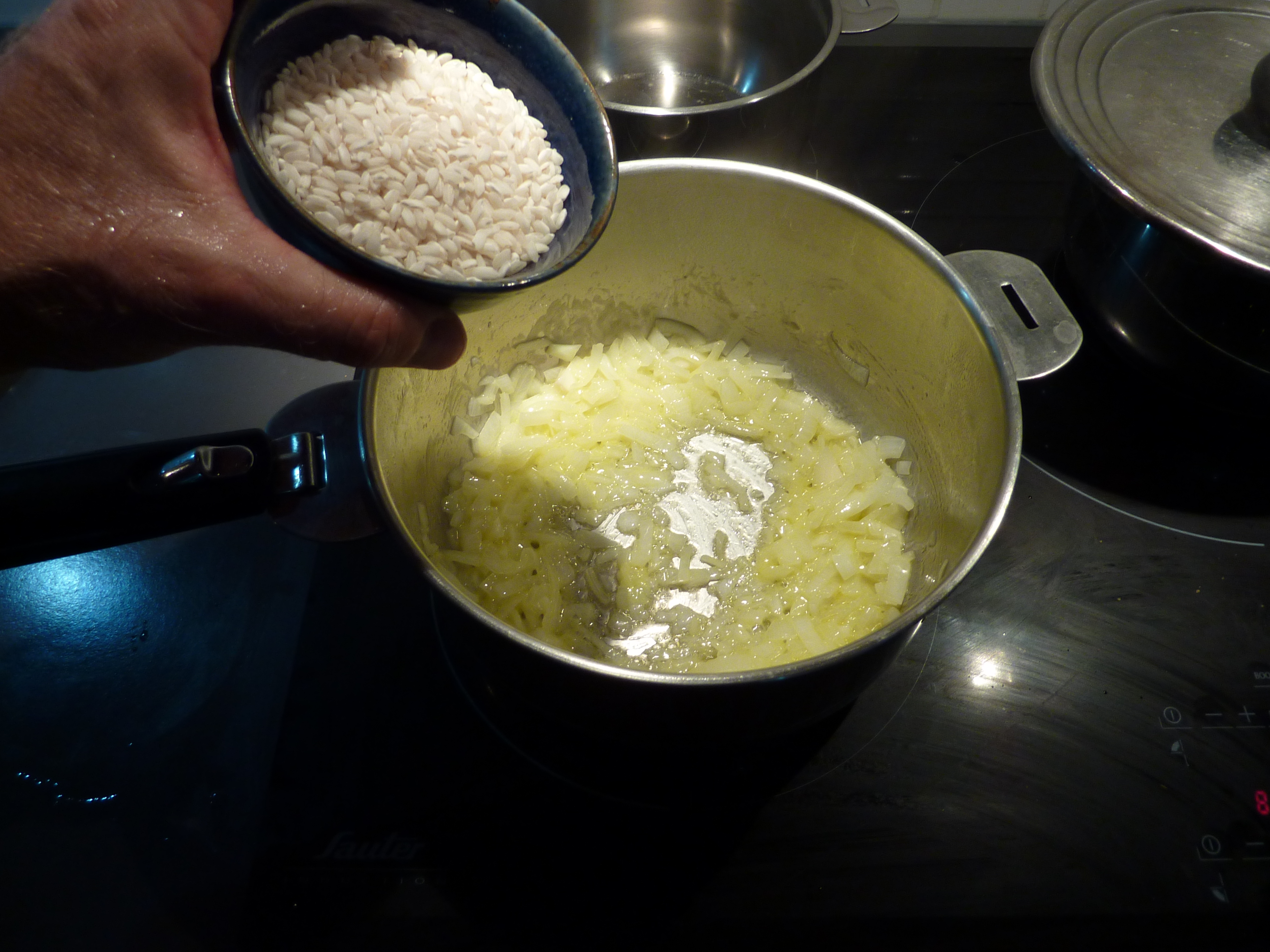 Ensuite, faites fondre un morceau de beurre dans une autre casserole, ajoutez l’oignon finement haché, attendez qu’il soit doré, et continuez avec le riz.