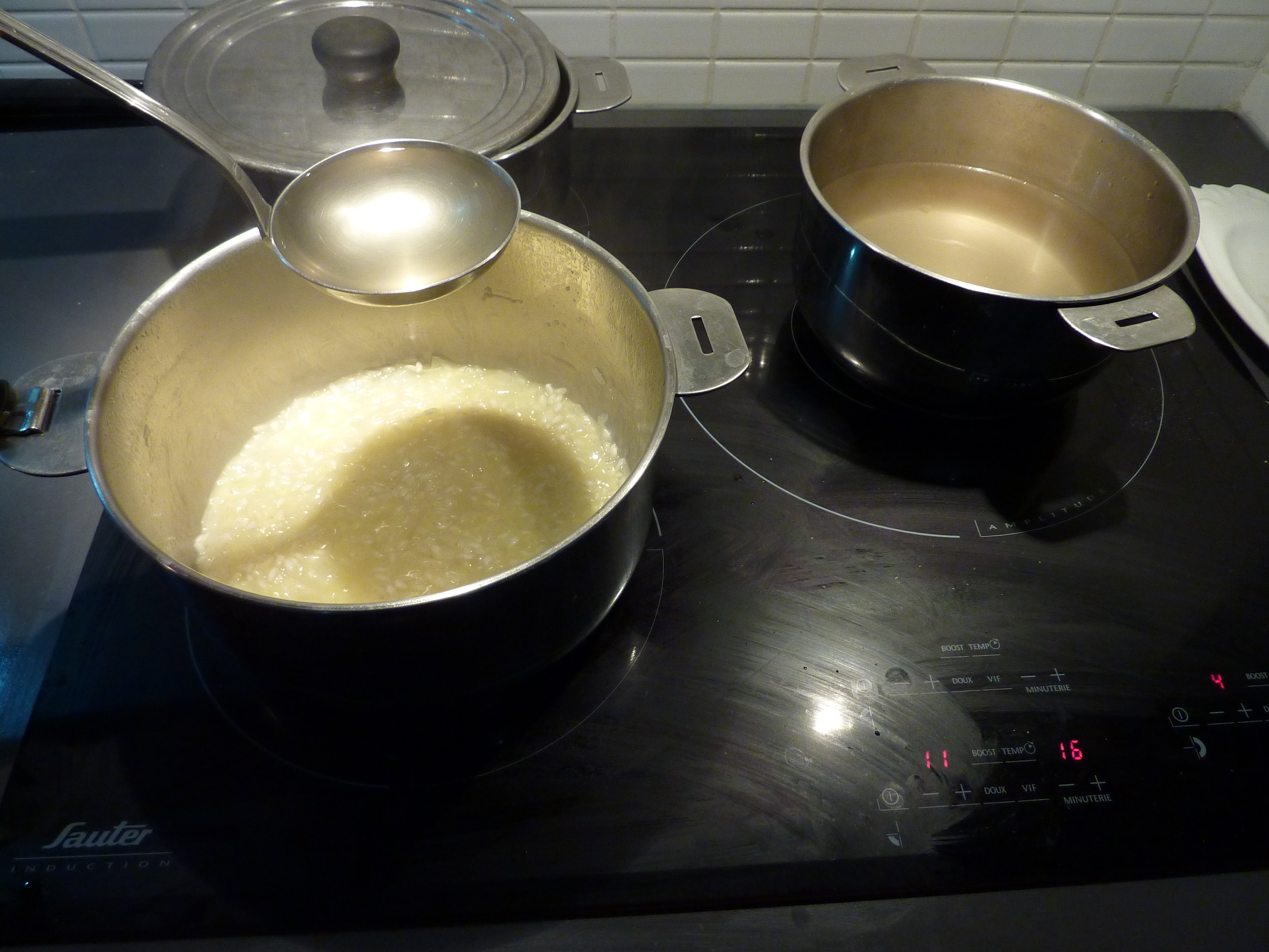 Touillez à l’aide d’une cuillère en bois, et torréfiez le riz pendant deux minutes. Il évacuera ainsi l’eau résiduelle et tiendra mieux la cuisson. Versez le demi verre de vin blanc sec, attendez qu’il soit évaporé, et commencez à ajouter une louche – après l’autre – de bouillon. Continuez à touiller.