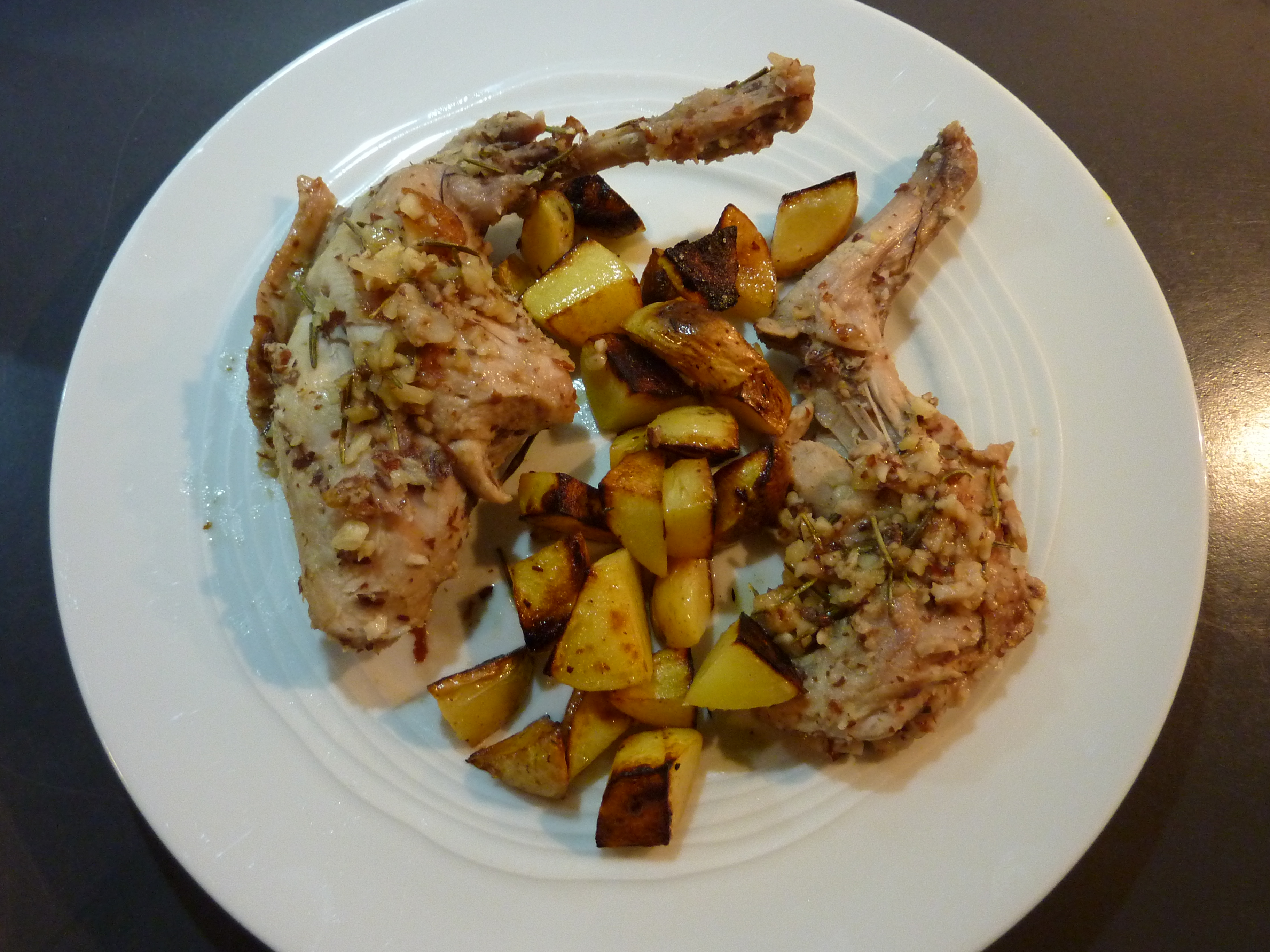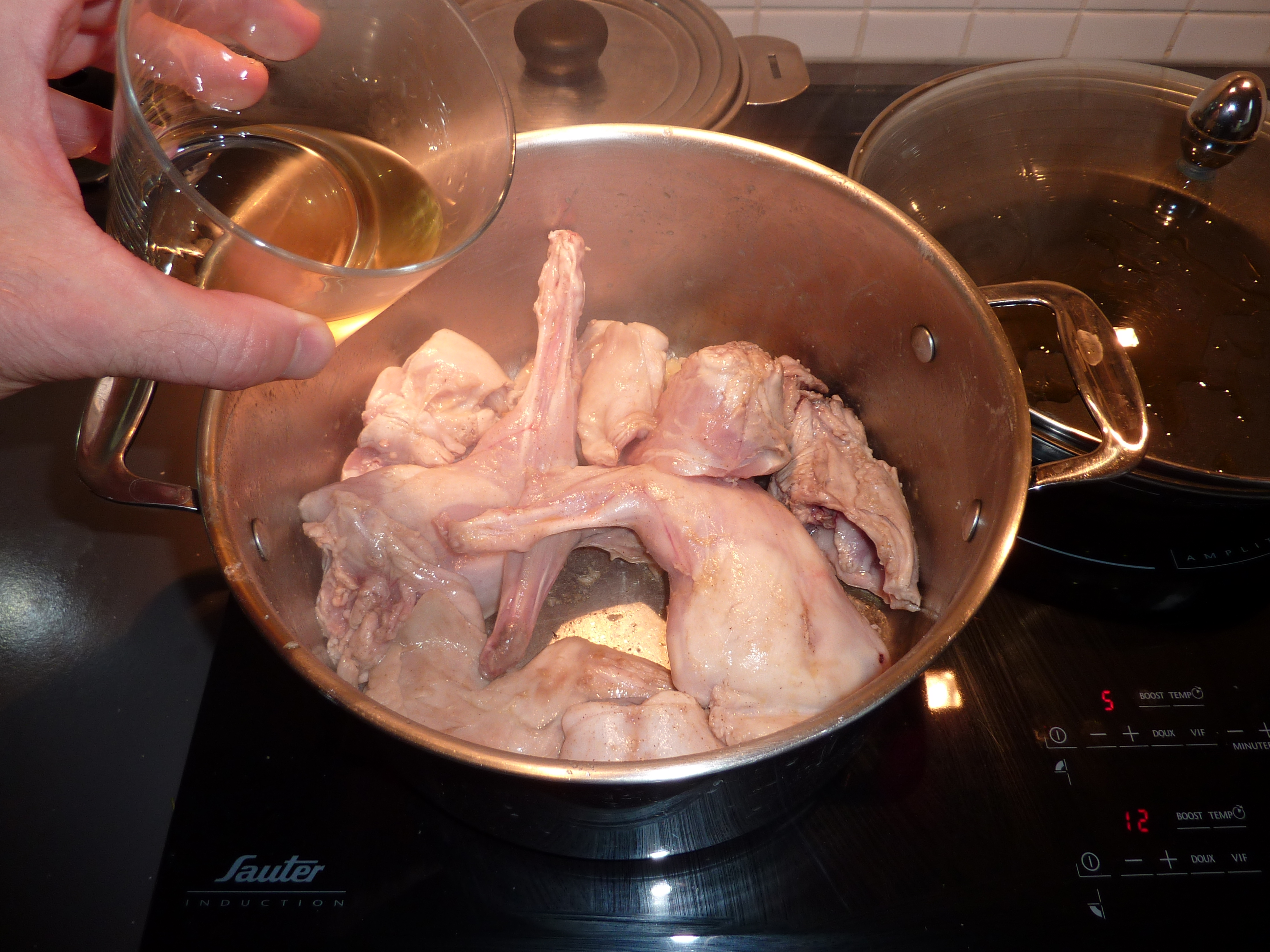 Récupérez les morceaux de lapin, séchez-les avec du sopalin. Faites chauffer un peu d’huile dans une grande casserole; posez-y la bête, salez, poivrez, touillez pendant un moment, et arrosez avec 1/4 de verre de vinaigre de vin blanc (de bonne qualité). Attendez que la viande soit dorée.