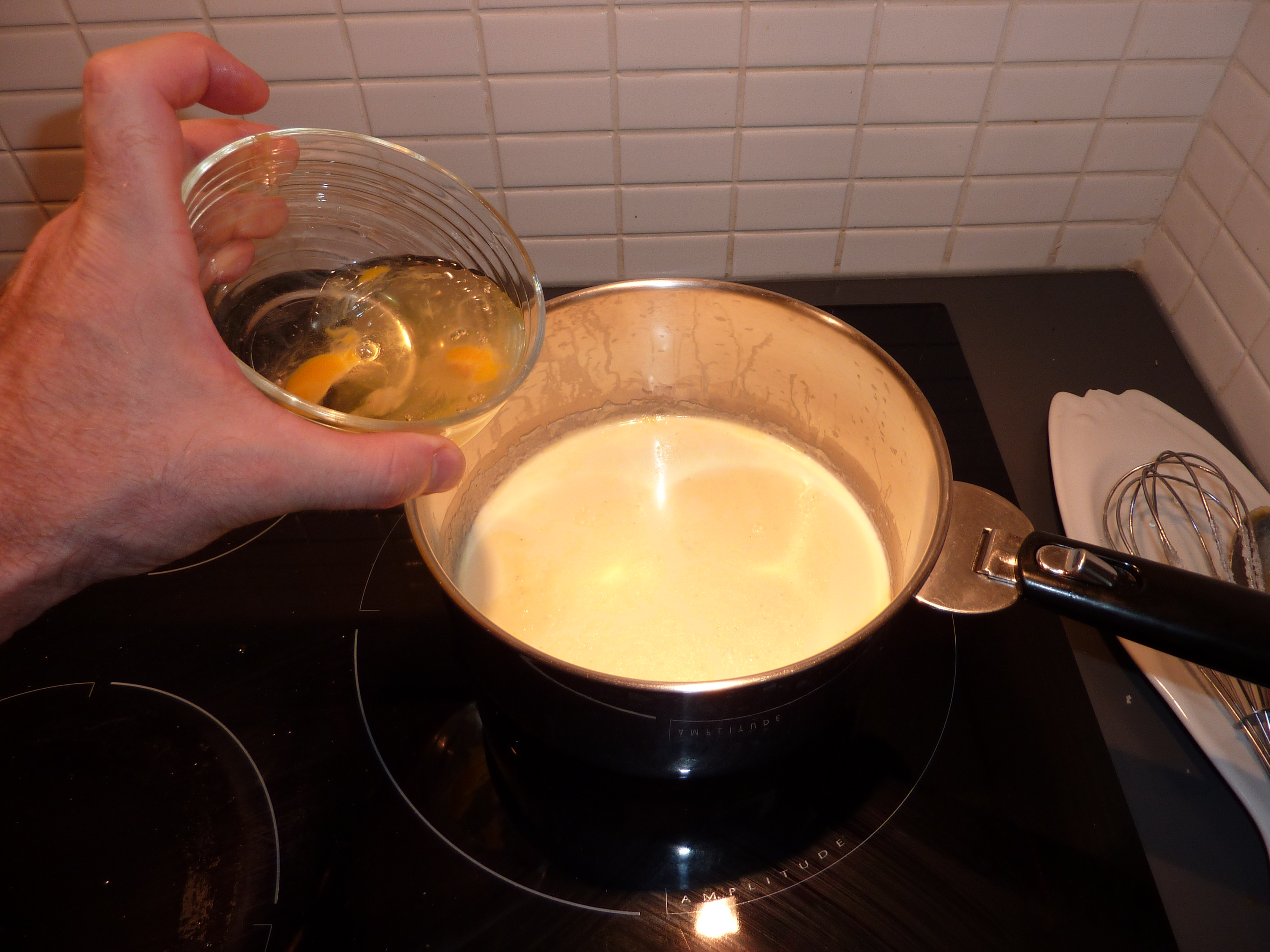 Retournons à la panna cotta, désormais refroidie. Retirez la vanille, versez-y deux blancs d’œuf, et touillez le tout.