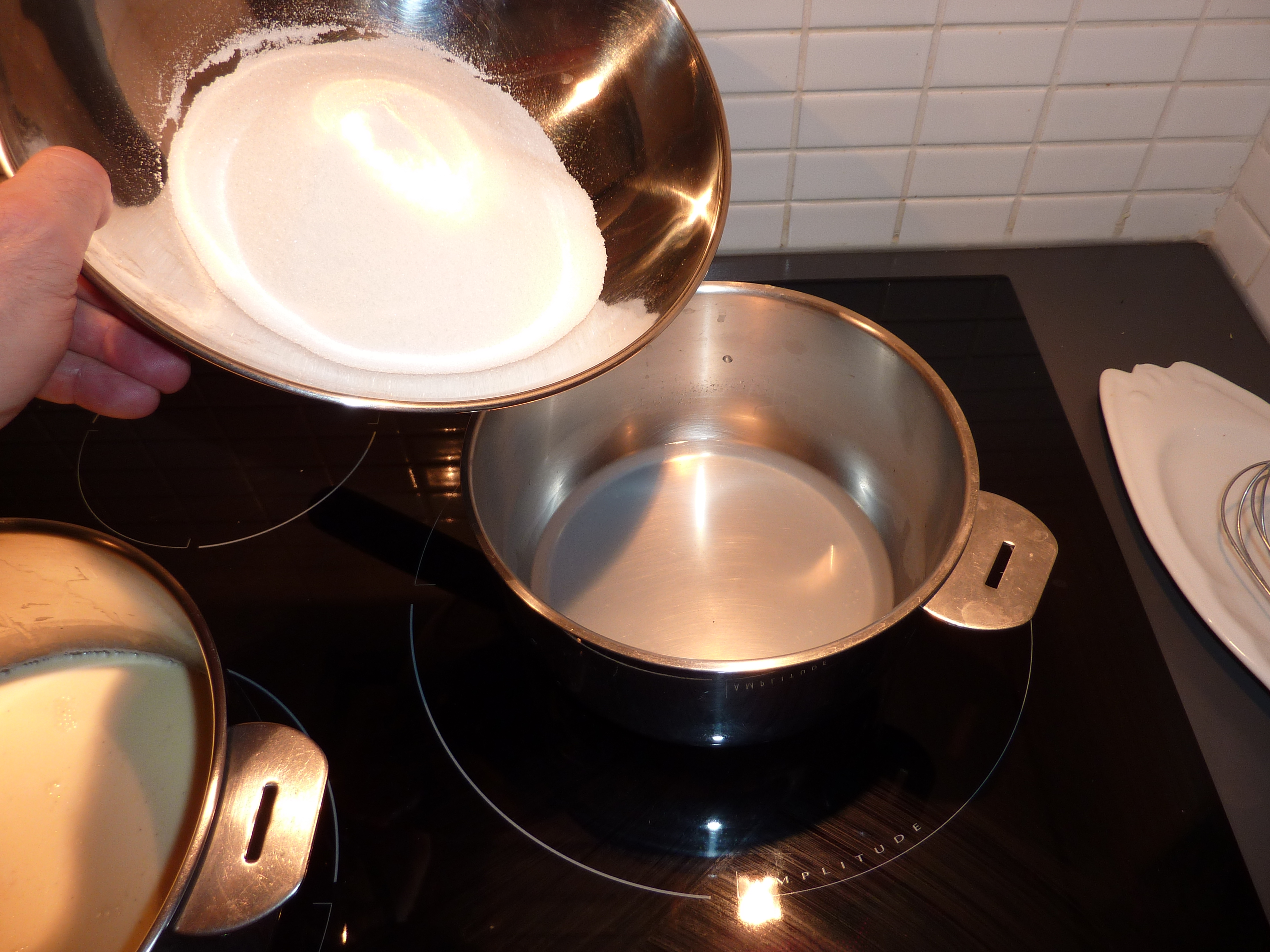 Occupez-vous maintenant du caramel. Faites chauffer le sucre dans une casserole, et ajoutez doucement de l’eau (la moitié de la quantité requise), en touillant de temps en temps à l’aide d’une cuillère en acier.
