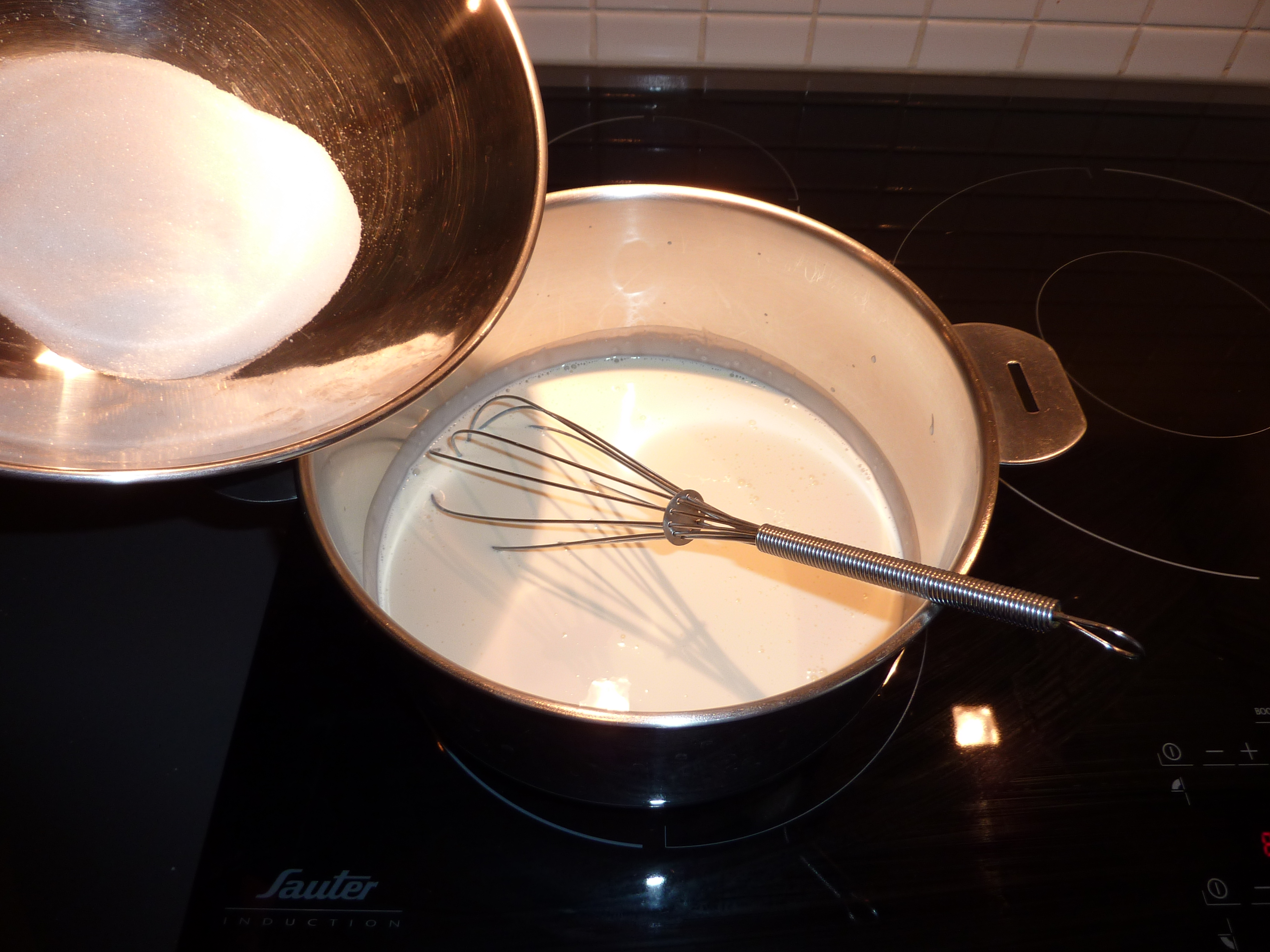 Touillez à l’aide d’un fouet, et ajoutez une pincée de sel, la crème fleurette, le sucre et la vanille. Portez à ébullition toujours en touillant pour dissoudre le sucre. Eteignez immédiatement et laissez refroidir.