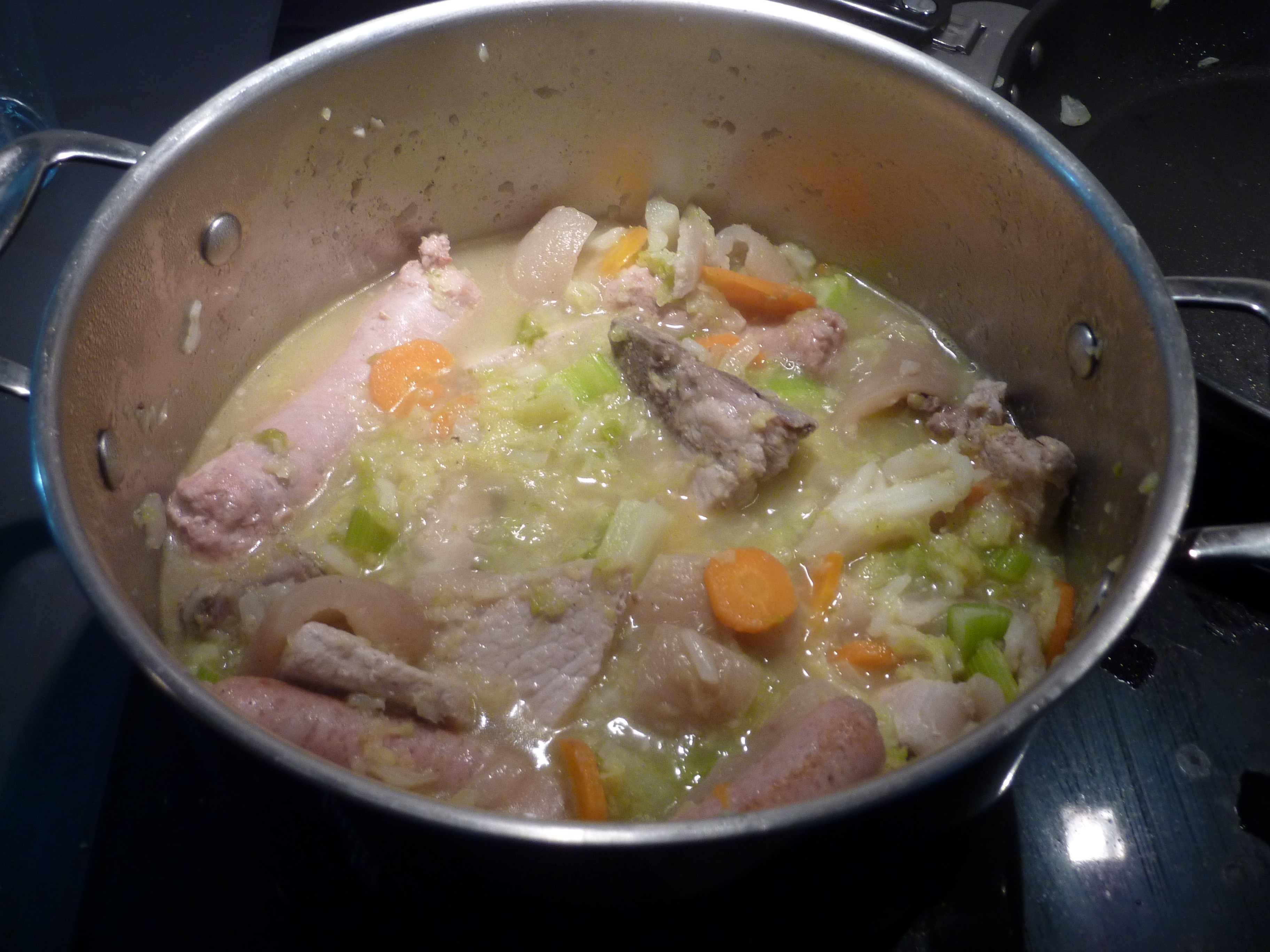 Laissez évaporez, puis ajoutez cette préparation dans votre faitout et laissez mijoter, salez et poivrez, ajoutez enfin les côtes de porc et la couenne, et faites cuire pendant une heure et demie.