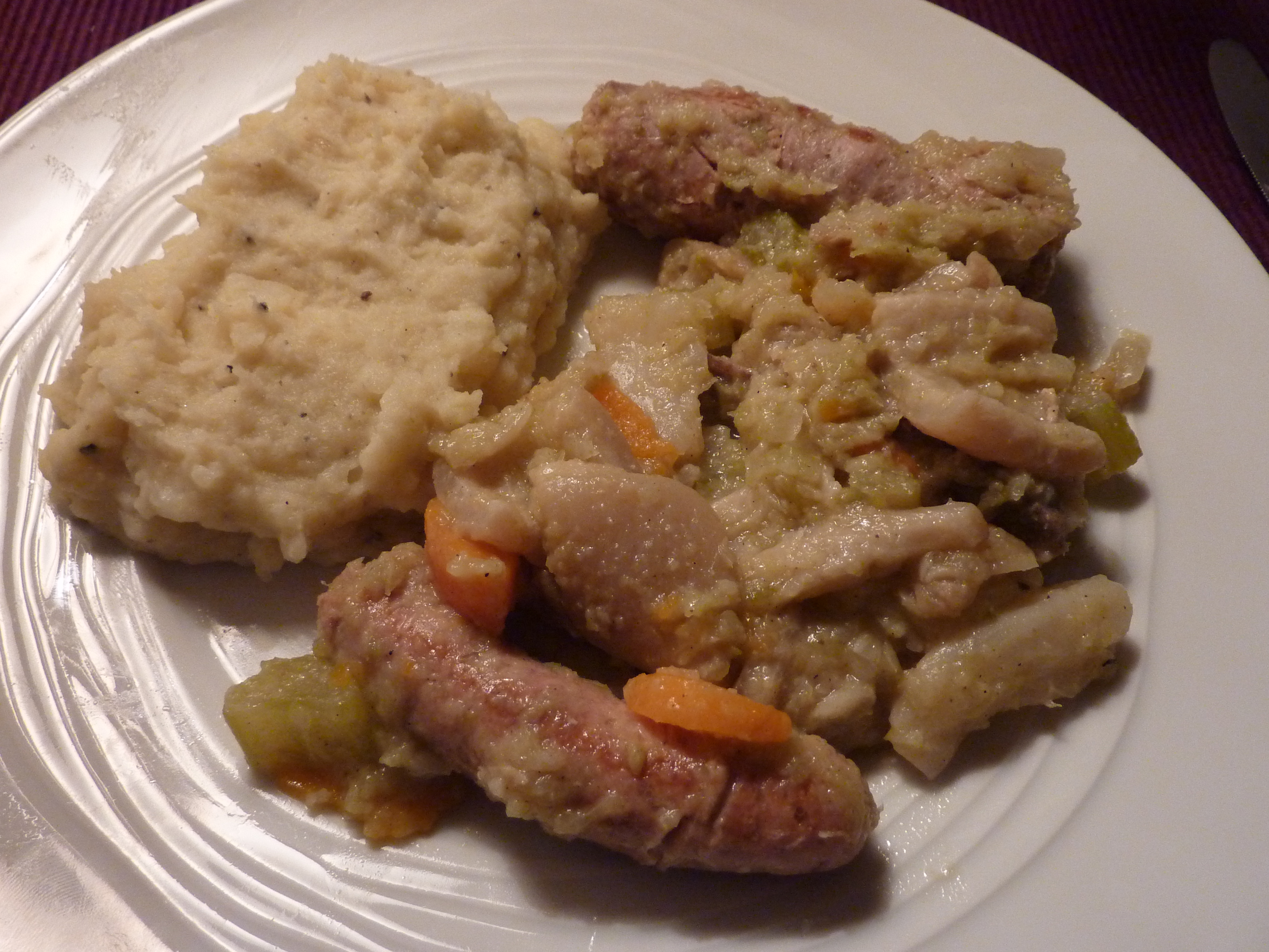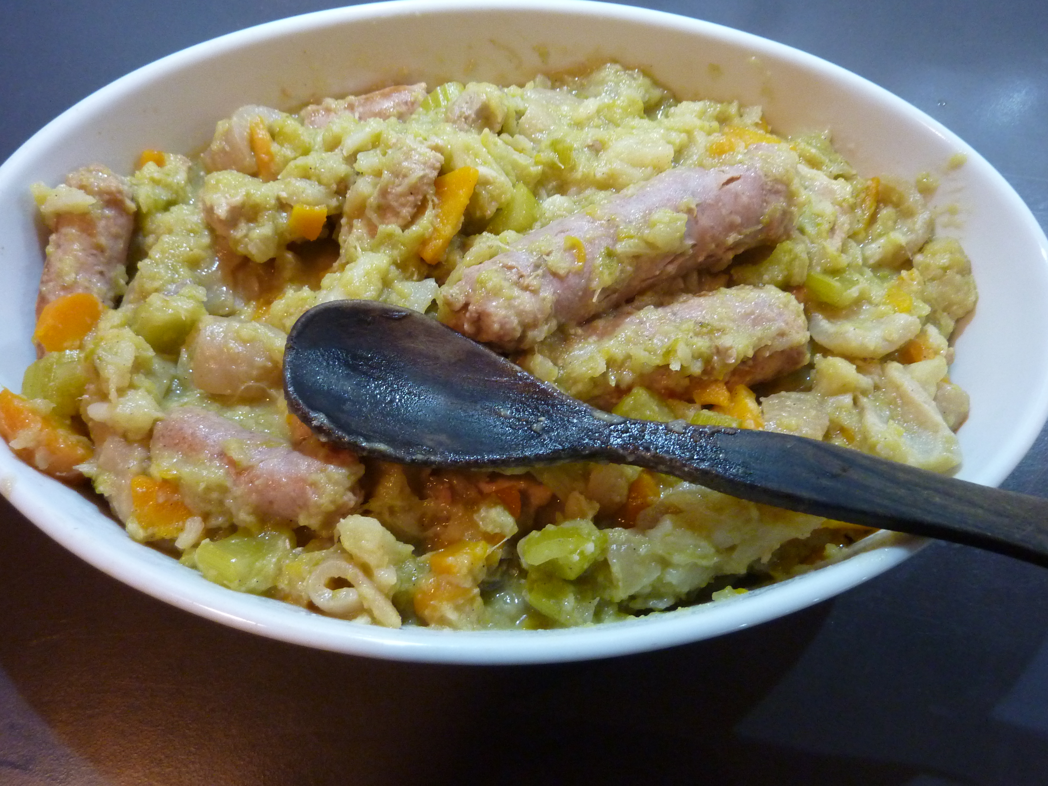 Moi aussi, puisque j’habite à Paris et non en Lombardie, j’ai adapté un petit peu la tradition, en écartant jarret et museau, et mettant à leur place de la saucisse au coteau (presque identique aux verzini), et de la chipolata (des merguez d’origine espagnole…) très proches de la luganega (autre saucisse typique de Lombardie mais d’ancienne origine romaine). Le chou frisé (dit aussi chou de Milan) et les autres ingrédients sont eux aussi au rendez-vous.