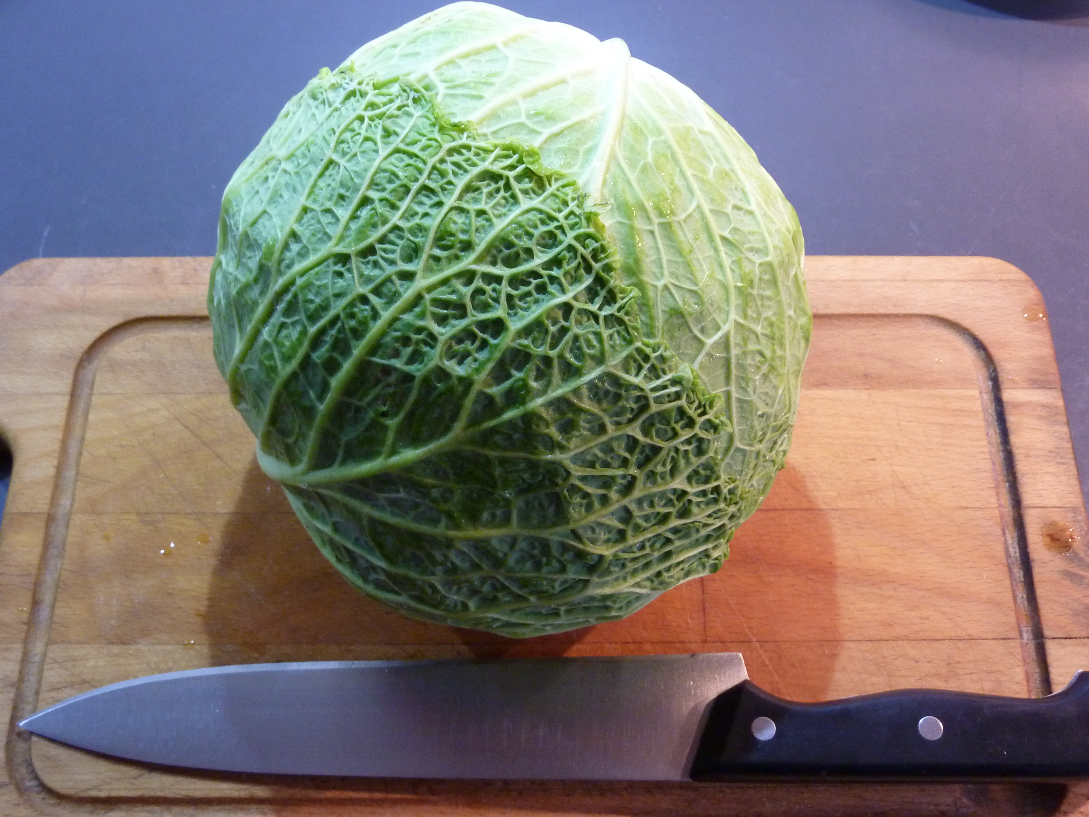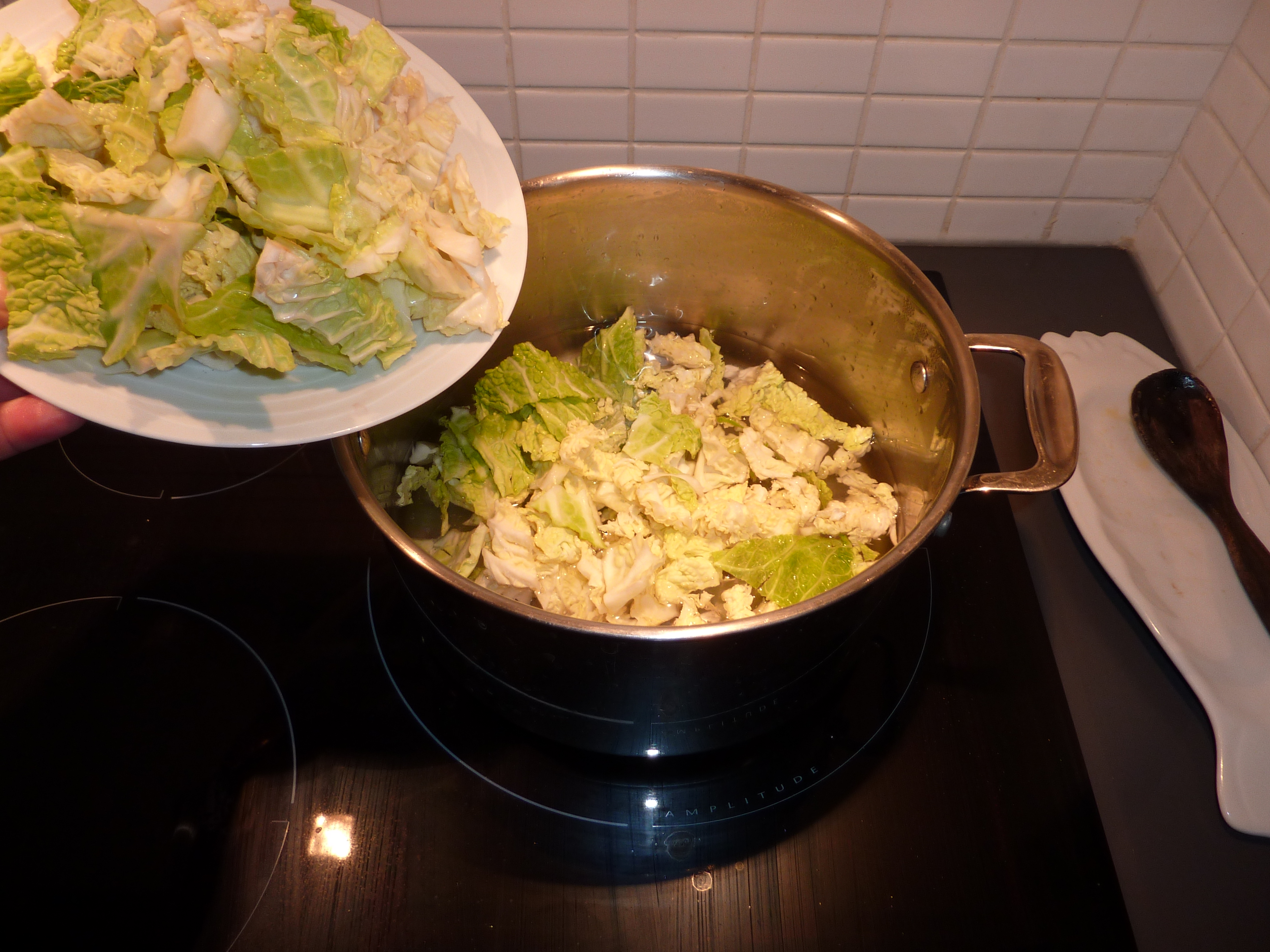 J’ai ensuite émincé le feuilles, et je les ai faites bouillir dans deux doigts d’eau, jusqu’à ce qu’elles soient tendres. A la fin, j’ai vidé l’eau dans l’évier. Attention, cela peut prendre pas mal de temps, et le dégât collatéral de cette opération c’est la mauvaise odeur du chou, due au fait que la plante contient du soufre. Rassurez-vous : il ne lui faut que 10 minutes pour disparaître. Et si encore vous hésitez, sachez que tous les choux sont des anti-inflammatoires naturels, riches en fer, calcium, fibres et acides gras, vitamines A et C…