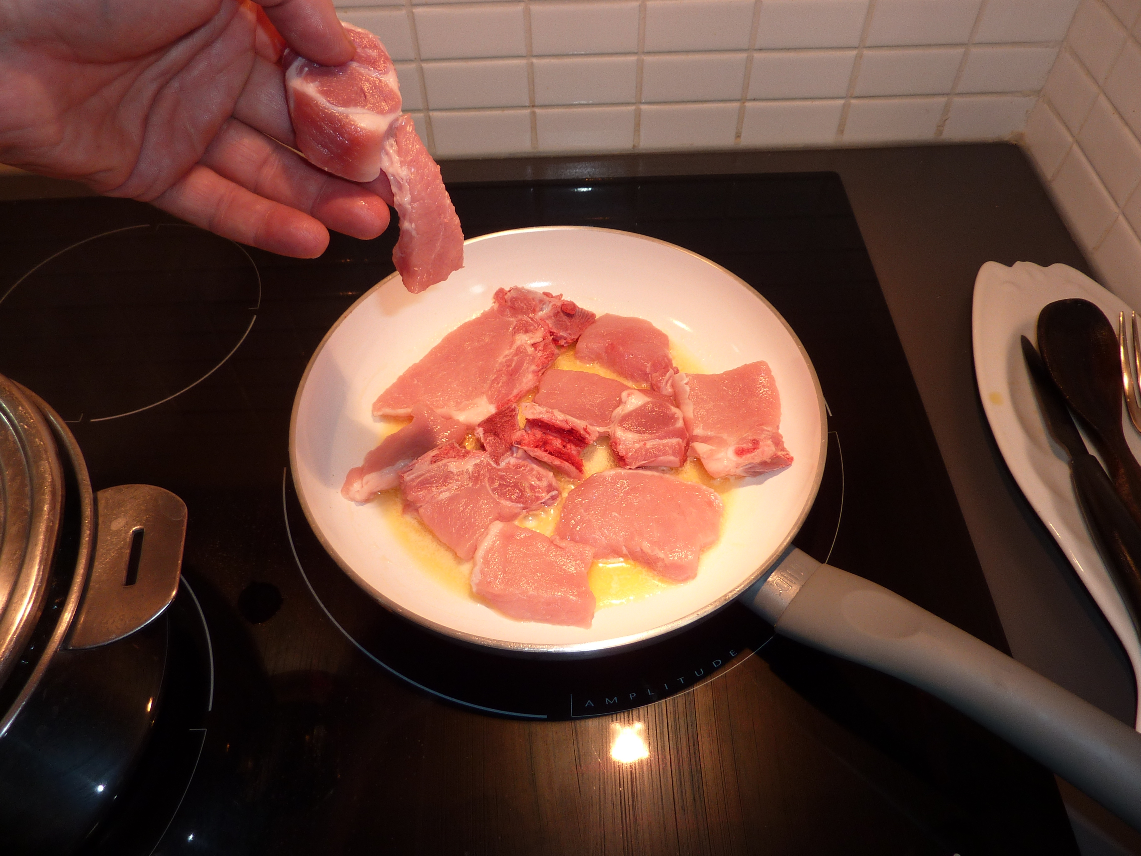 J’ai commencé par ébouillanter la couenne pendant trois quarts d’heure. Après quoi je l’ai égoutté et séché avec du sopalin. Entre temps, j’ai doré dans une poêle les côtes de porc (coupées très fines) dans du beurre pendant une dizaine de minutes. Puis je les ai tamponnées avec du sopalin.