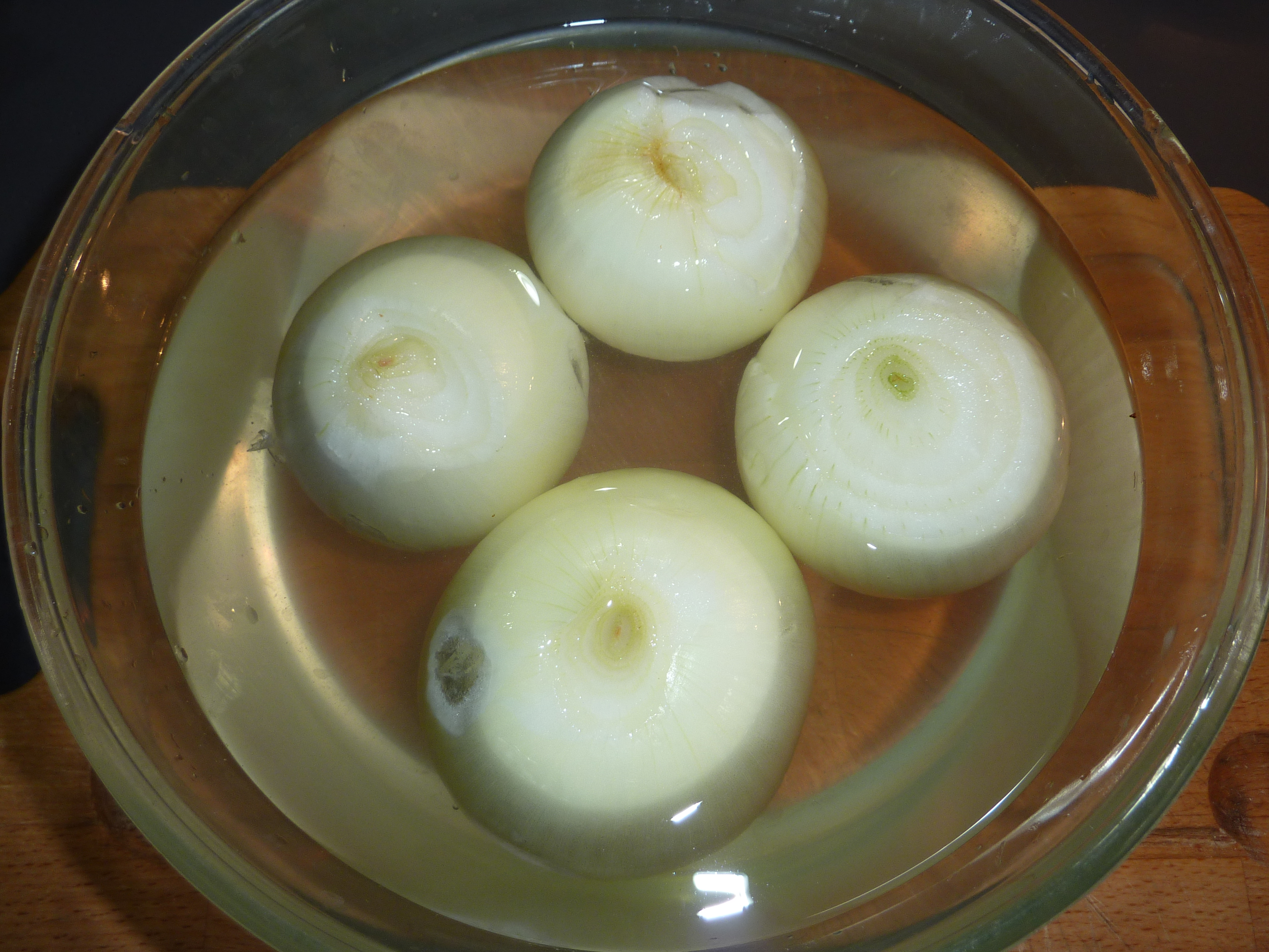 Commencez à mettre les oignons dans de l’eau froide avec une goutte de vinaigre pendant au moins une vingtaine de minutes. Ainsi faisant, vous éviterez de pleurer en le coupant, parce que vous aurez éliminé les effets du sulfoxyde.