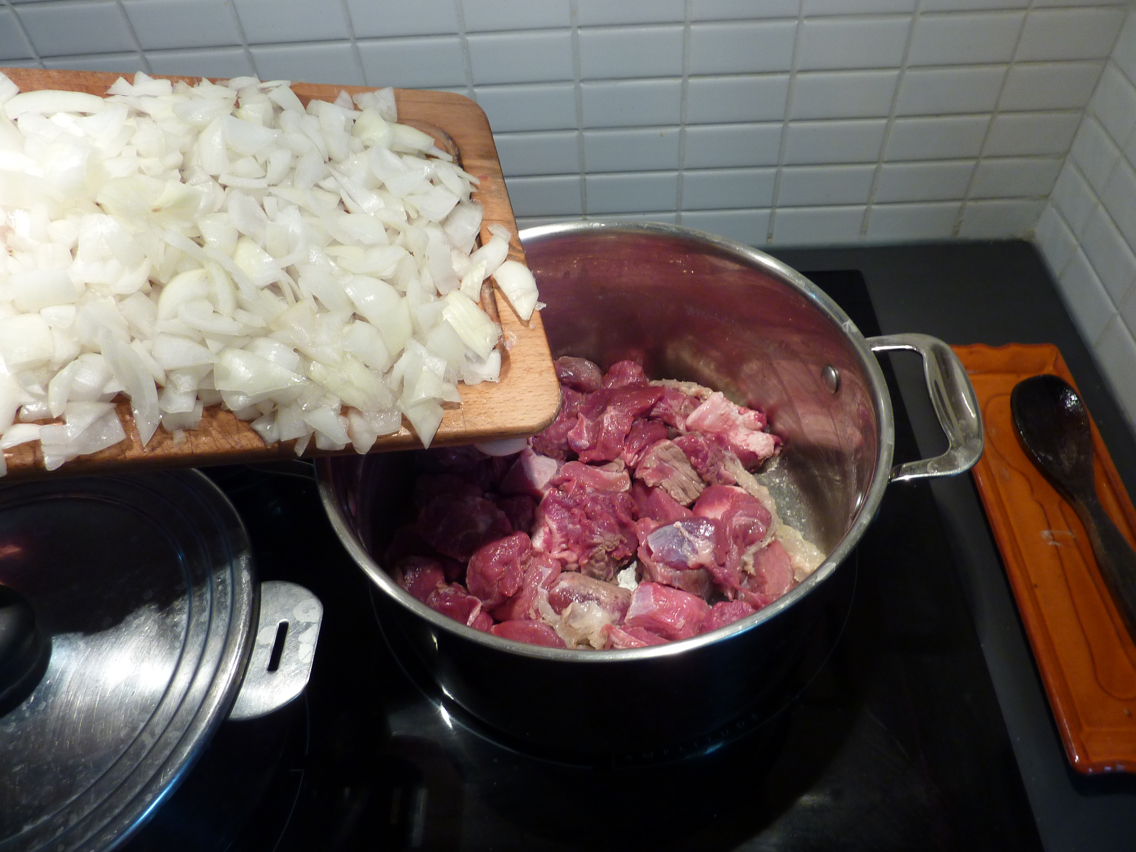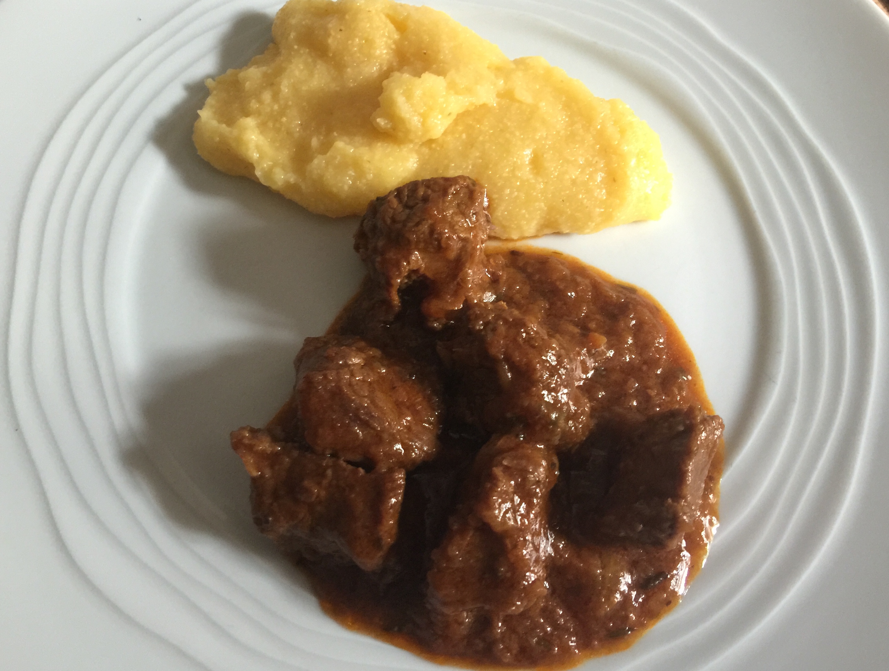 Bien, après cette chevauchée sauvage dans l’espace et le temps, revenons à notre plat. Il est composé d’un morceau de viande de boeuf – girello di spalla en italien, paleron pour les Français – , et de lard de porc – à ne pas confondre avec la bas-joue et la poitrine fumée. Cette graisse, appelée aussi bardière ou panne, est située sur le dos de la bête. La sauce est réalisée avec quatre gros oignons, deux gousses d’ail, du paprika et des aromates, de la pulpe de tomates, un cube de bouillon de boeuf, de l’huile extra vierge d’olives. La garniture n’est pas faite de carottes et de pommes de terre comme en Hongrie, mais de polenta.
