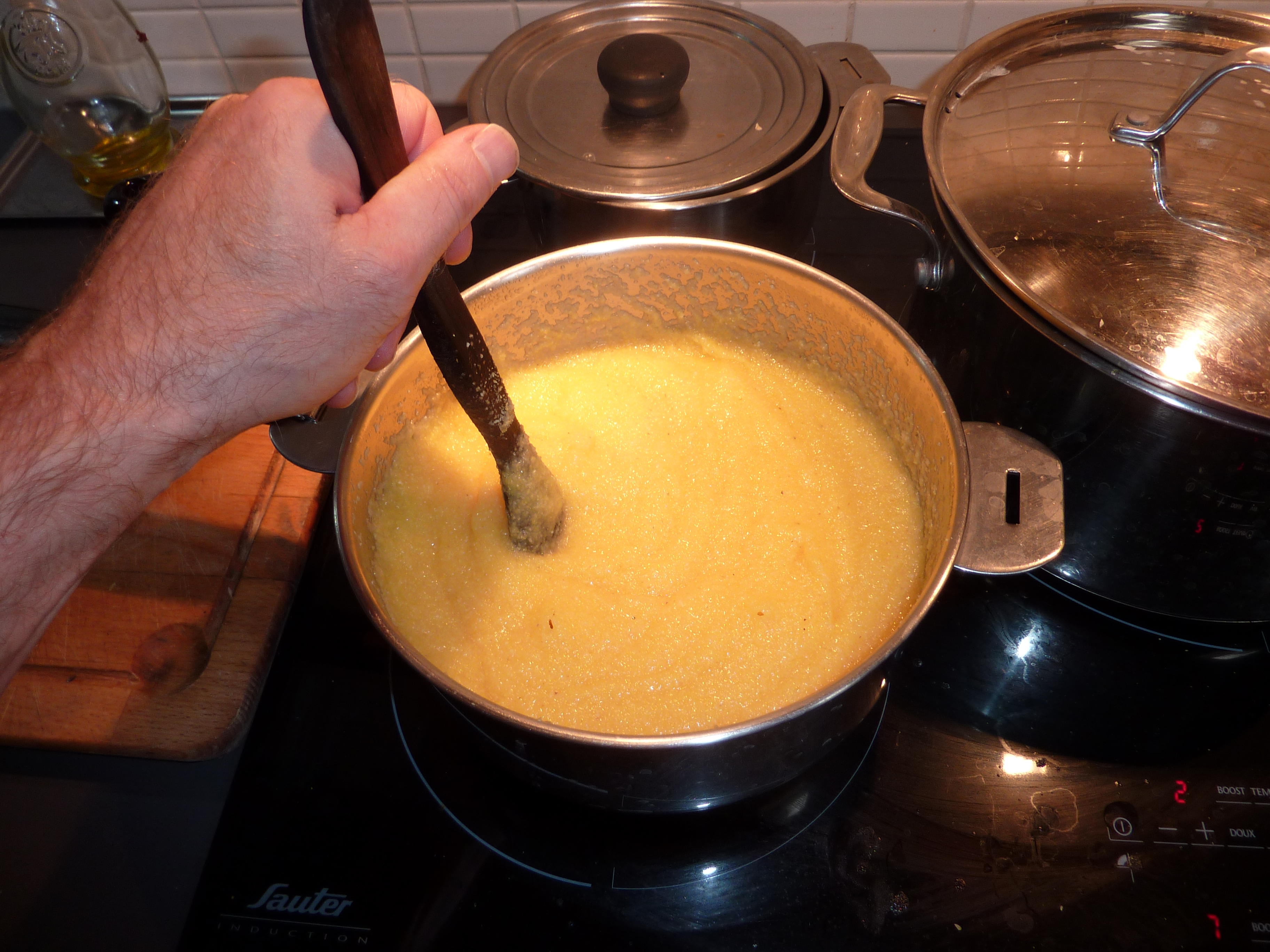 Dix minutes avant la fin de la cuisson du goulash, occupez-vous de la polenta. Je suis un peu flemmard; donc j’ai opté pour celle déjà ‘prête’. Il faut seulement mettre à bouillir un litre et 1/4 d’eau, et y verser le contenu d’un sachet. Après quoi, il suffit de touiller pendant cinq minutes à feu moyen en veillant à ce que la purée ne soit ni trop sèche ni trop liquide. Au moment de servir, versez un filet d’huile.