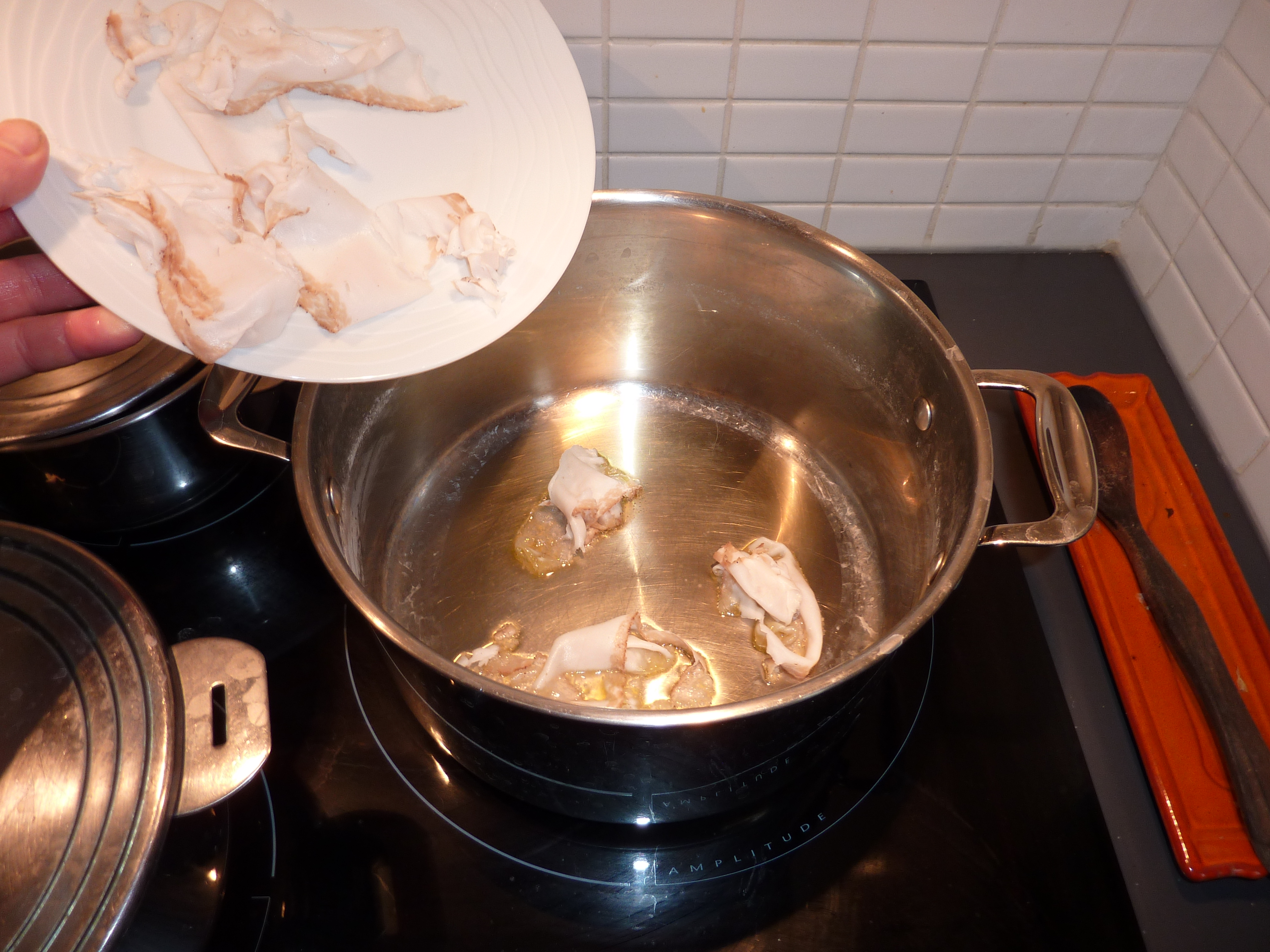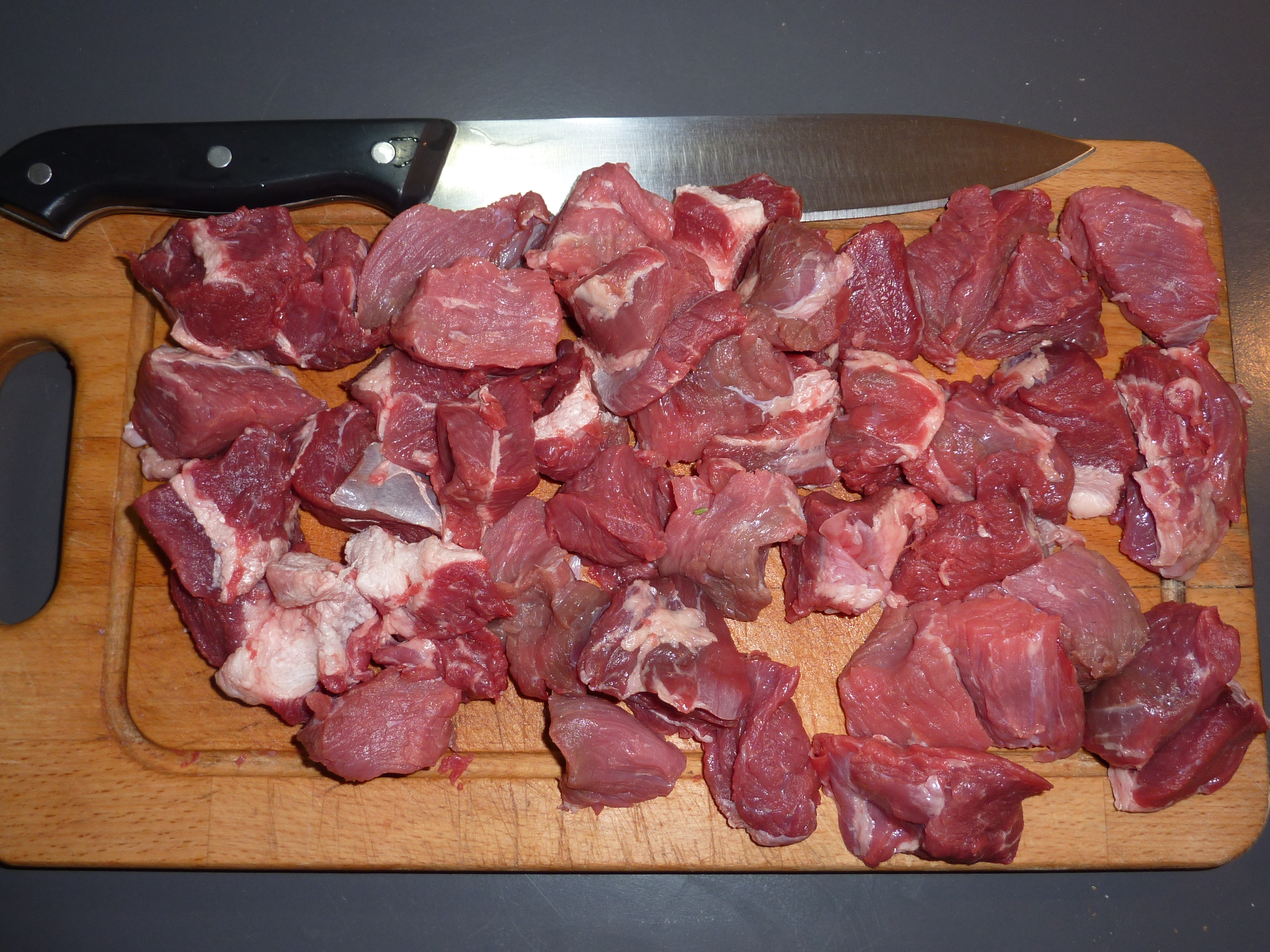Entre temps, coupez la viande en cubes de taille moyenne, et mettez à bouillir l’eau pour le bouillon.