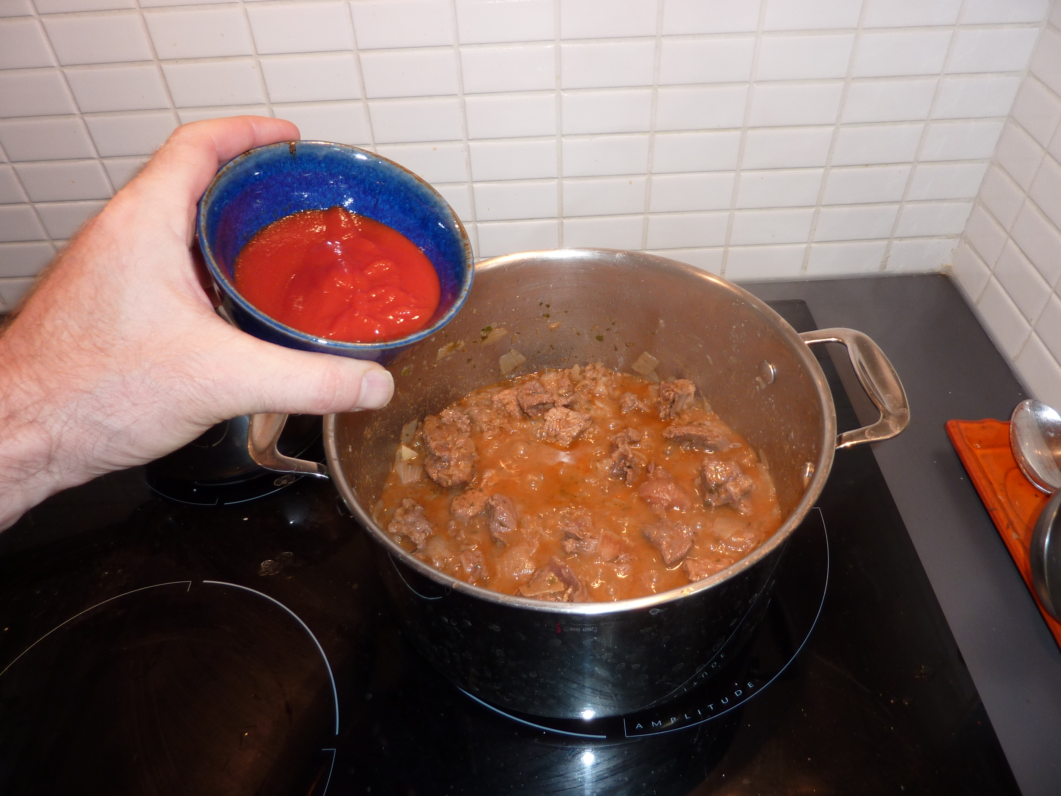 A present, rajoutez de la pulpe de tomate et du poivre. Touillez, et laissez mijoter pendant deux heures à feu modéré, en ajoutant régulièrement quelques louches de bouillon pour que le ragoût ne soit pas trop réduit.
