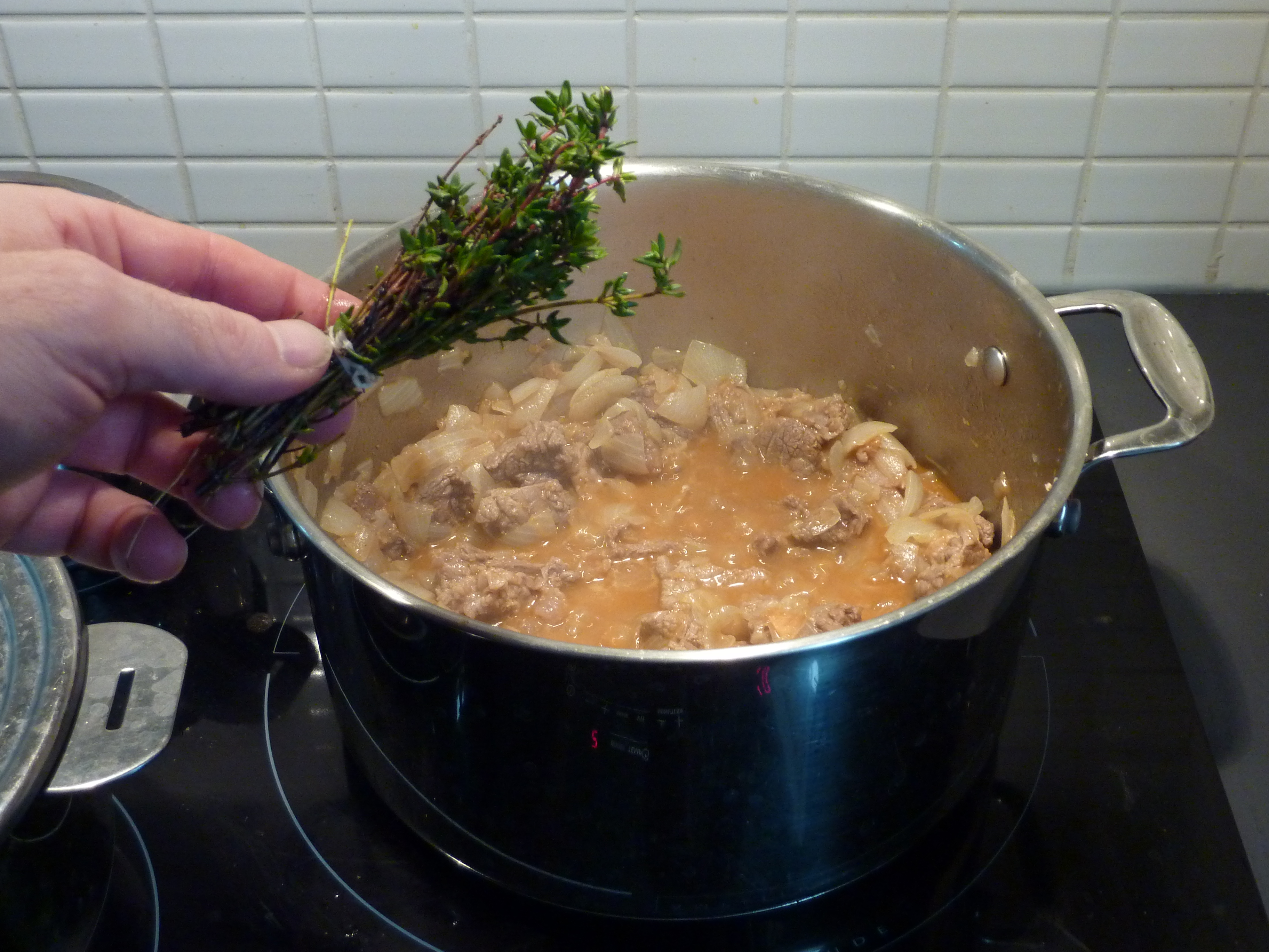 Passé ce délais, ajoutez deux cuillères à soupe de paprika doux, deux gousses d’ail, deux cuillères de farine, les aromates (marjolaine, estragon, thym); du sel fin…