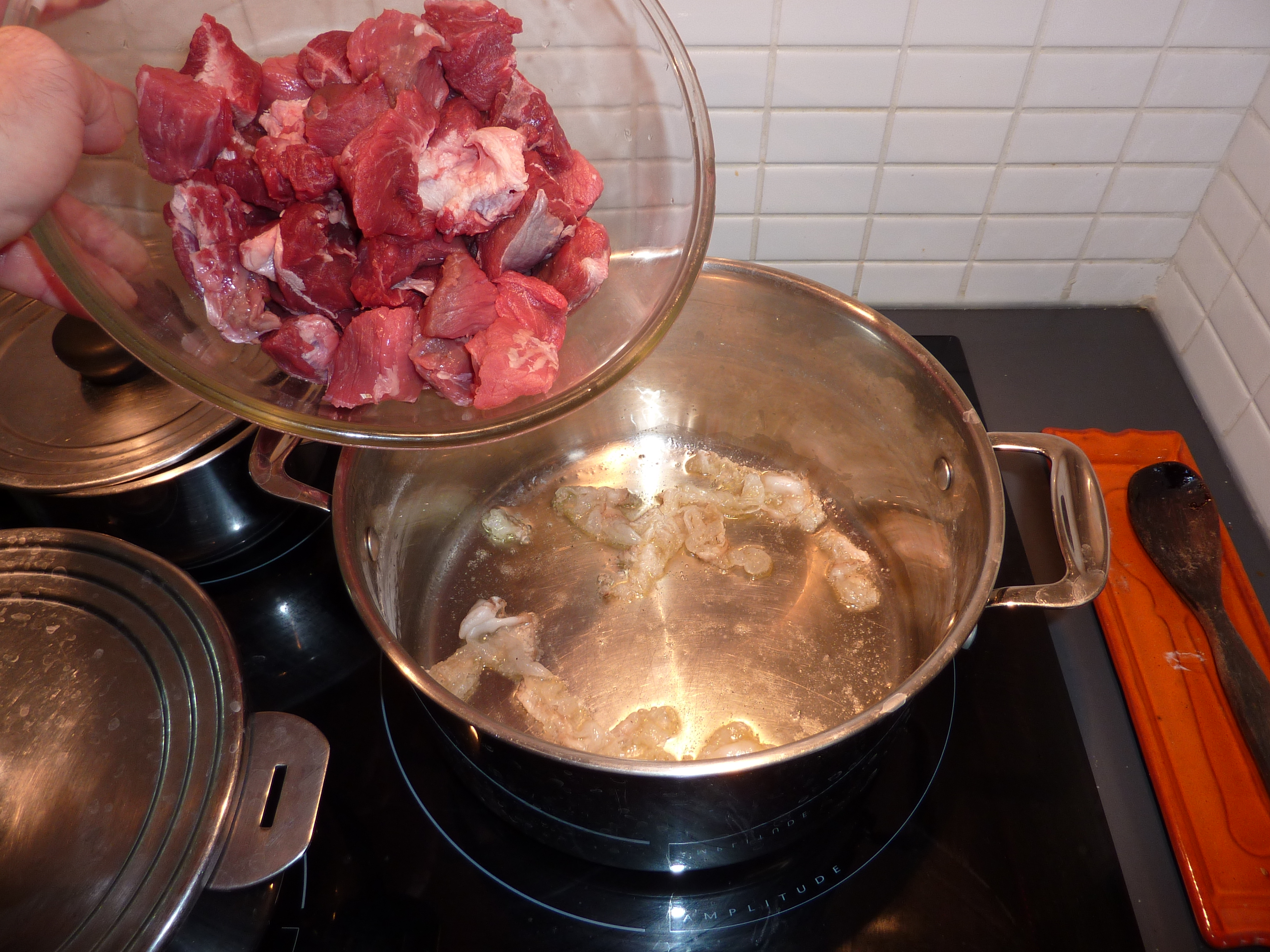 Dans un faitout, mettez à chauffer de l’huile, et ajoutez les tranches de lard. Touillez et ajoutez la viande…