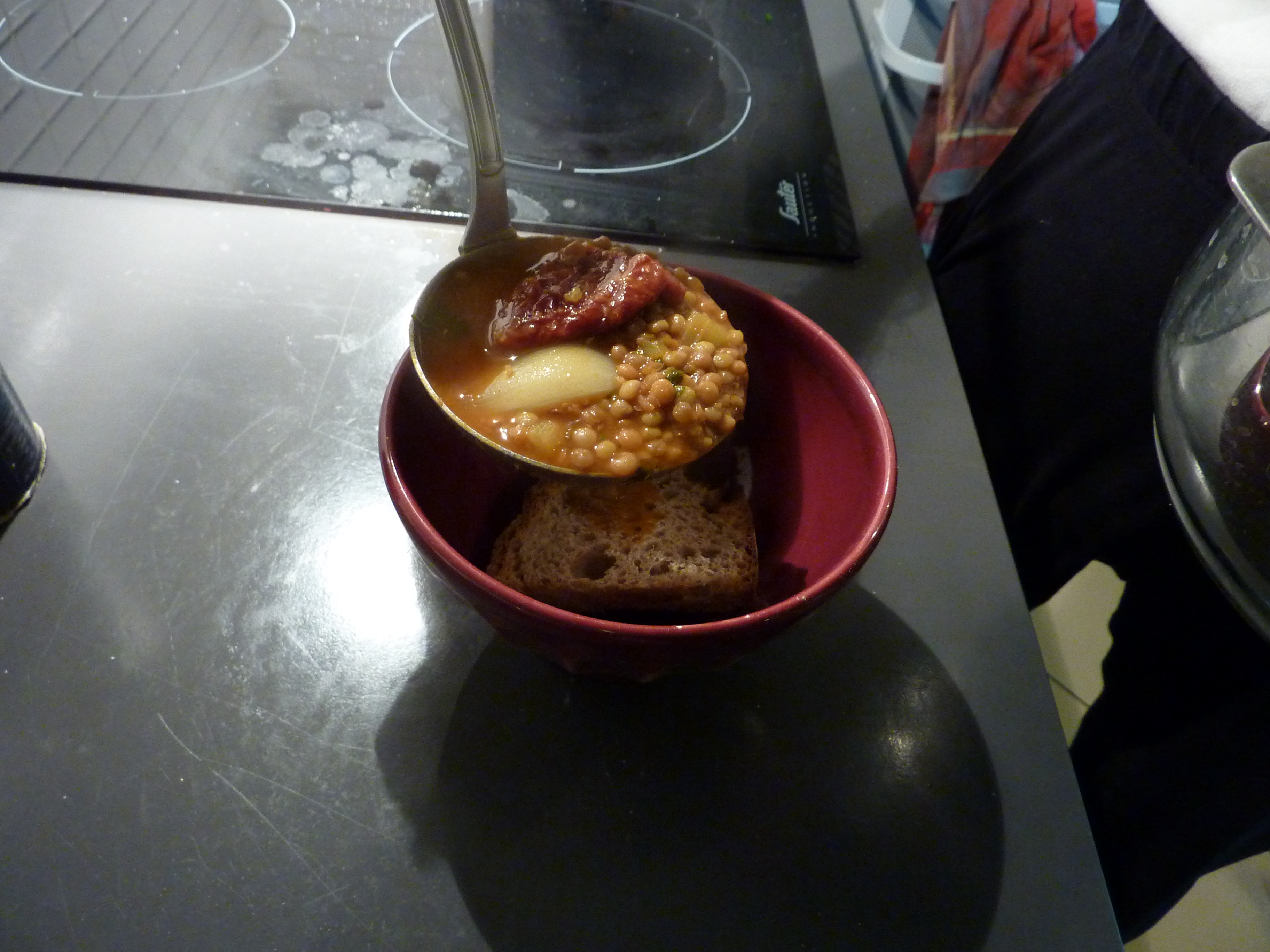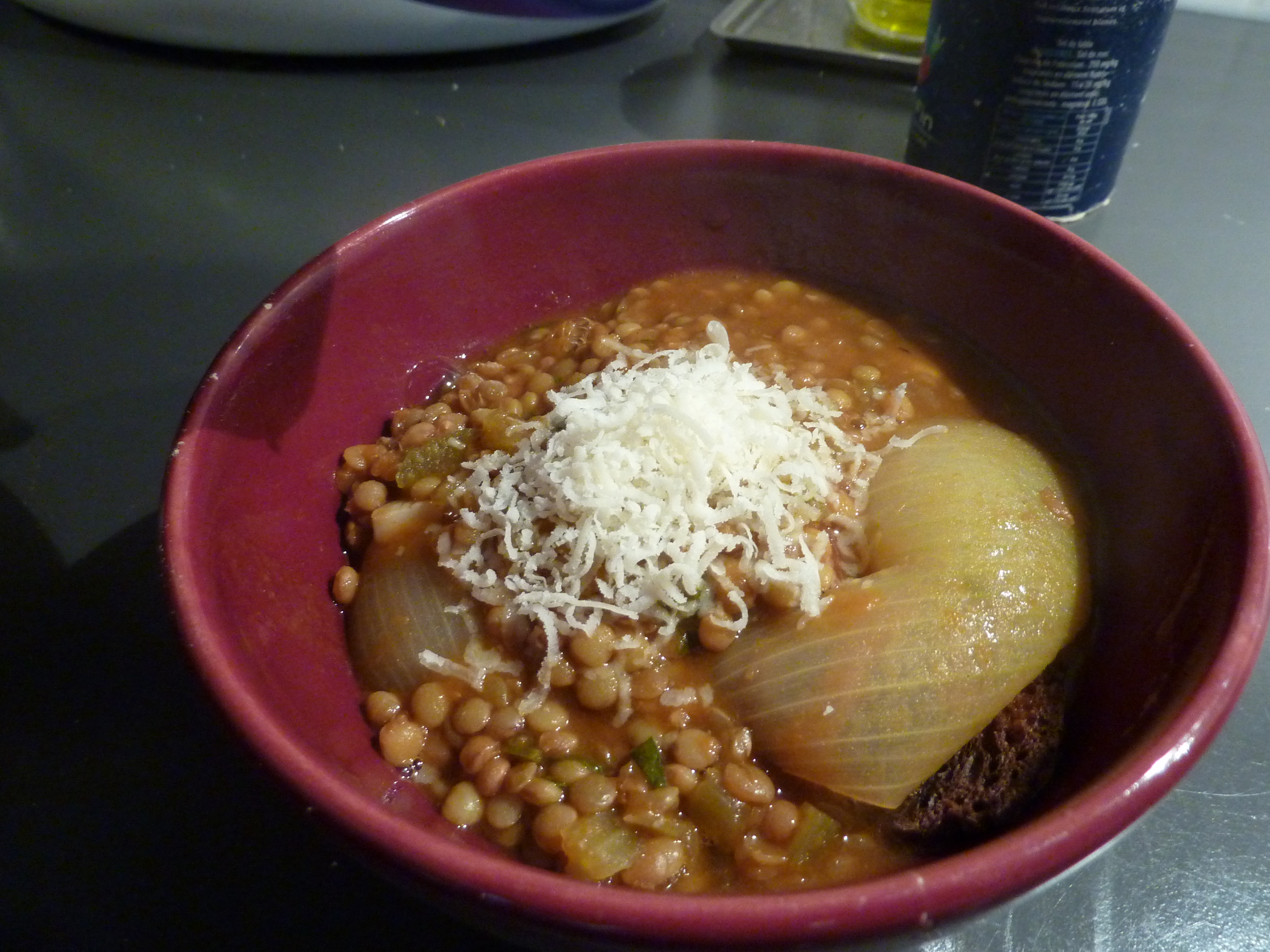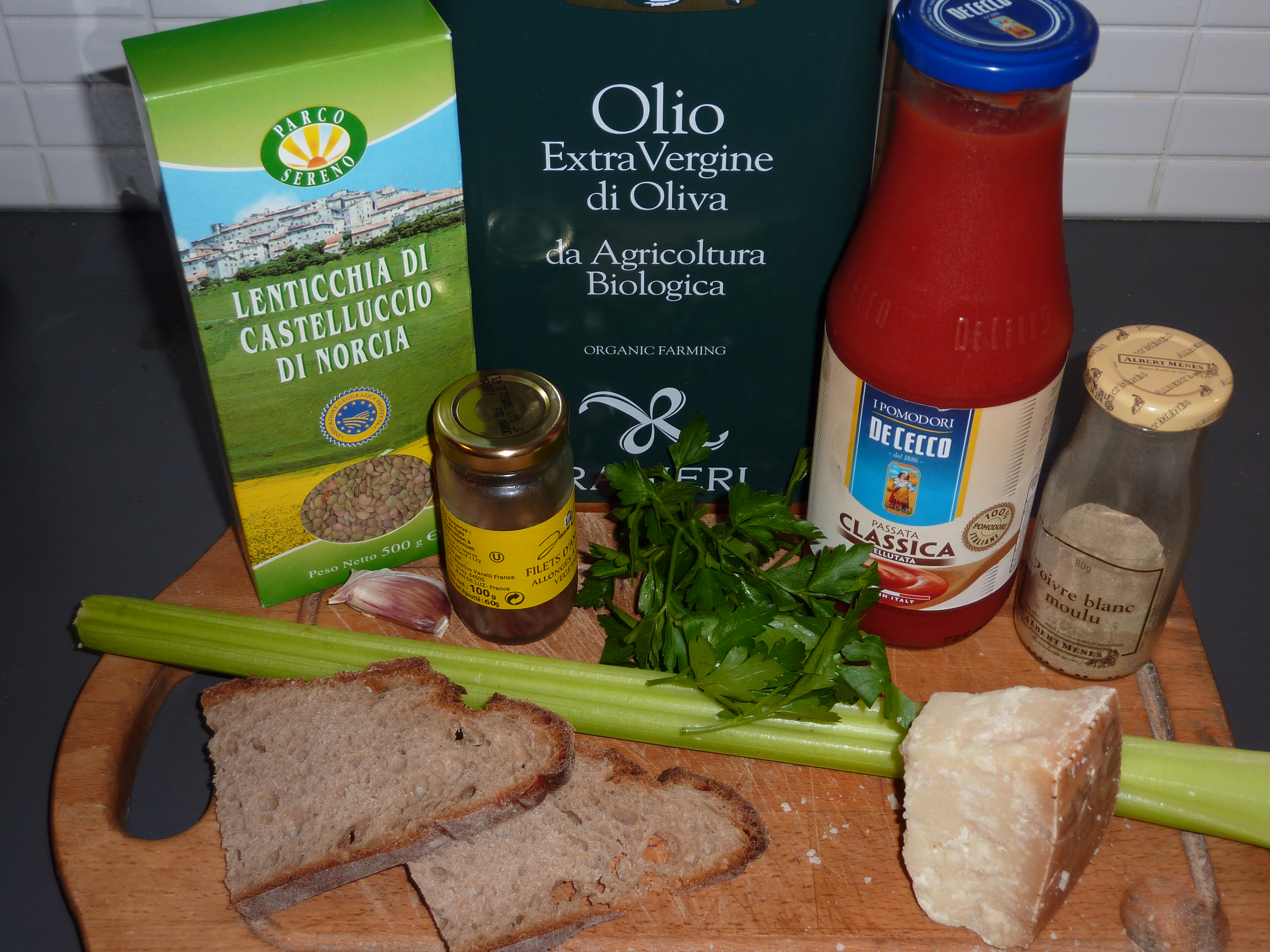 La recette que j’exécute aujourd’hui est issue de cette région. Elle associe des lentilles, bien sûr, mais aussi des anchois, de l’ail, du céleri, du pecorino d’Ombrie, du pain grillé, et quelques rajouts, à ma façon.