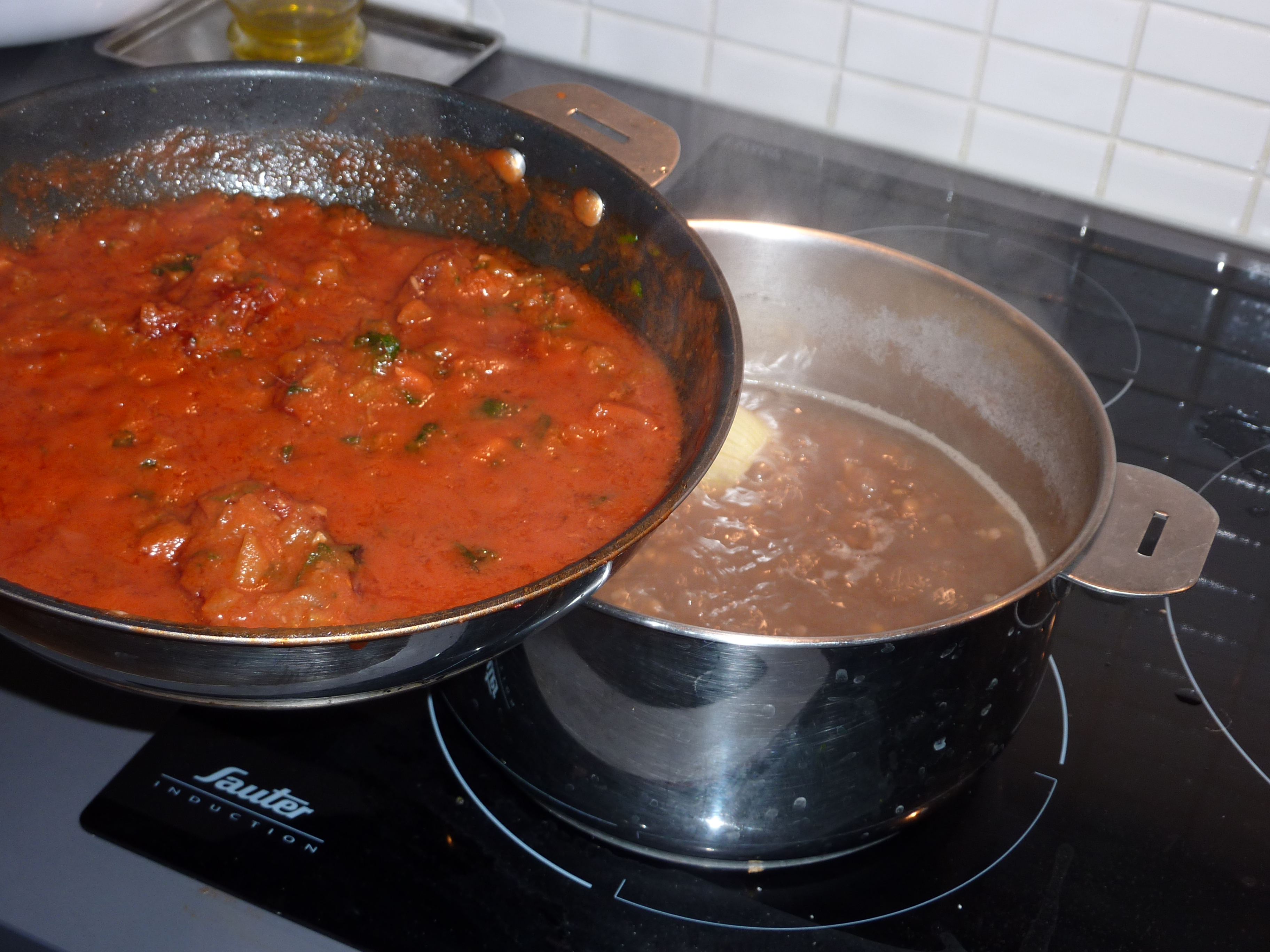 Le moment venu, versez la pulpe de tomates…et trois ou quatre tomates confites, histoire de donner plus de corps à l’ensemble. Attendez que la sauce réduise.