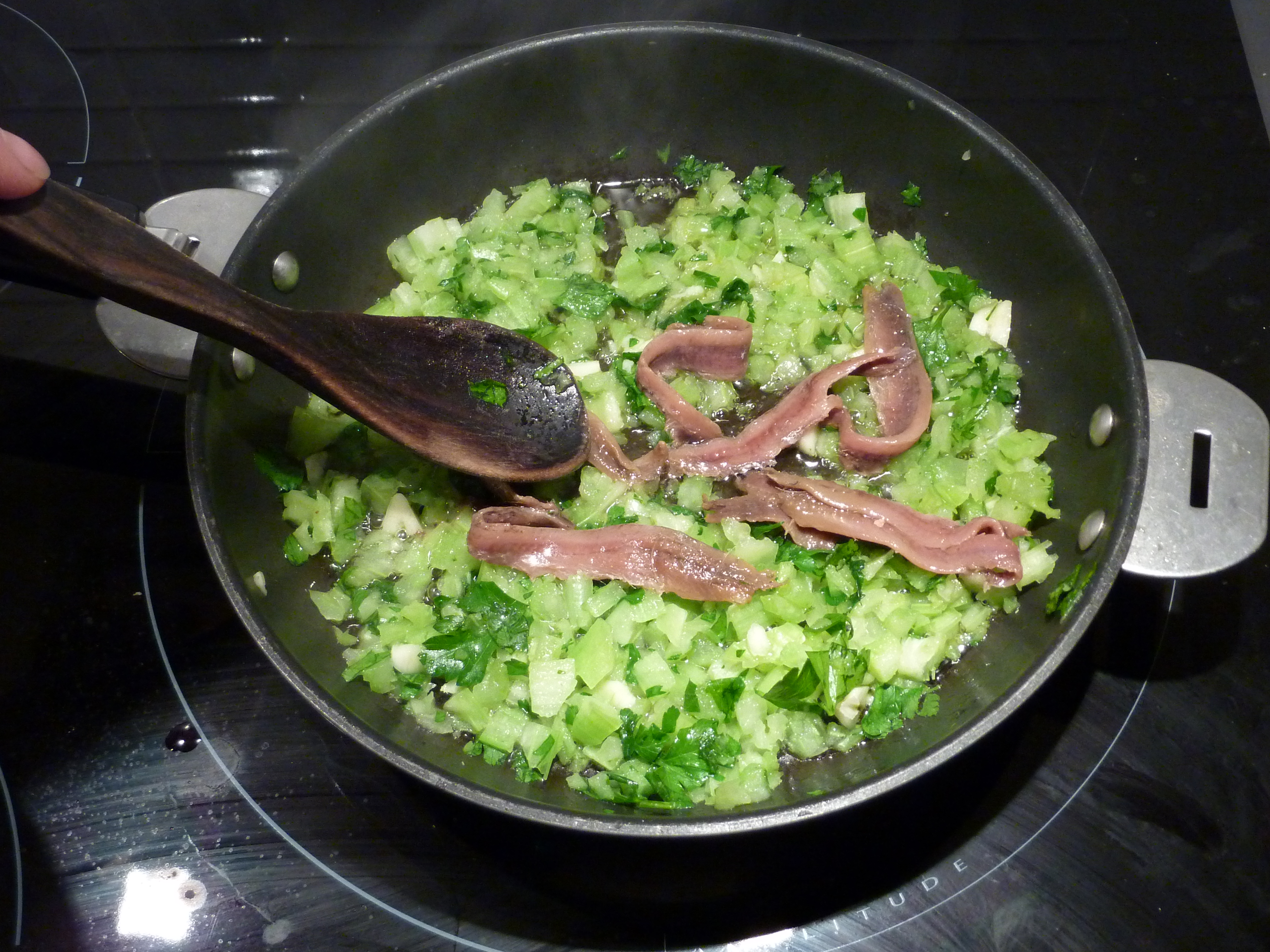Attendez quelques minutes, et ajoutez les anchois.Touillez avec une cuillère en bois (à ne jamais laver avec du liquide vaisselles, faute de quoi vous aurez des résidus chimique sur votre langue – et dans le bois – des semaines durant !), jusqu’à ce qu’elles soient dissous.