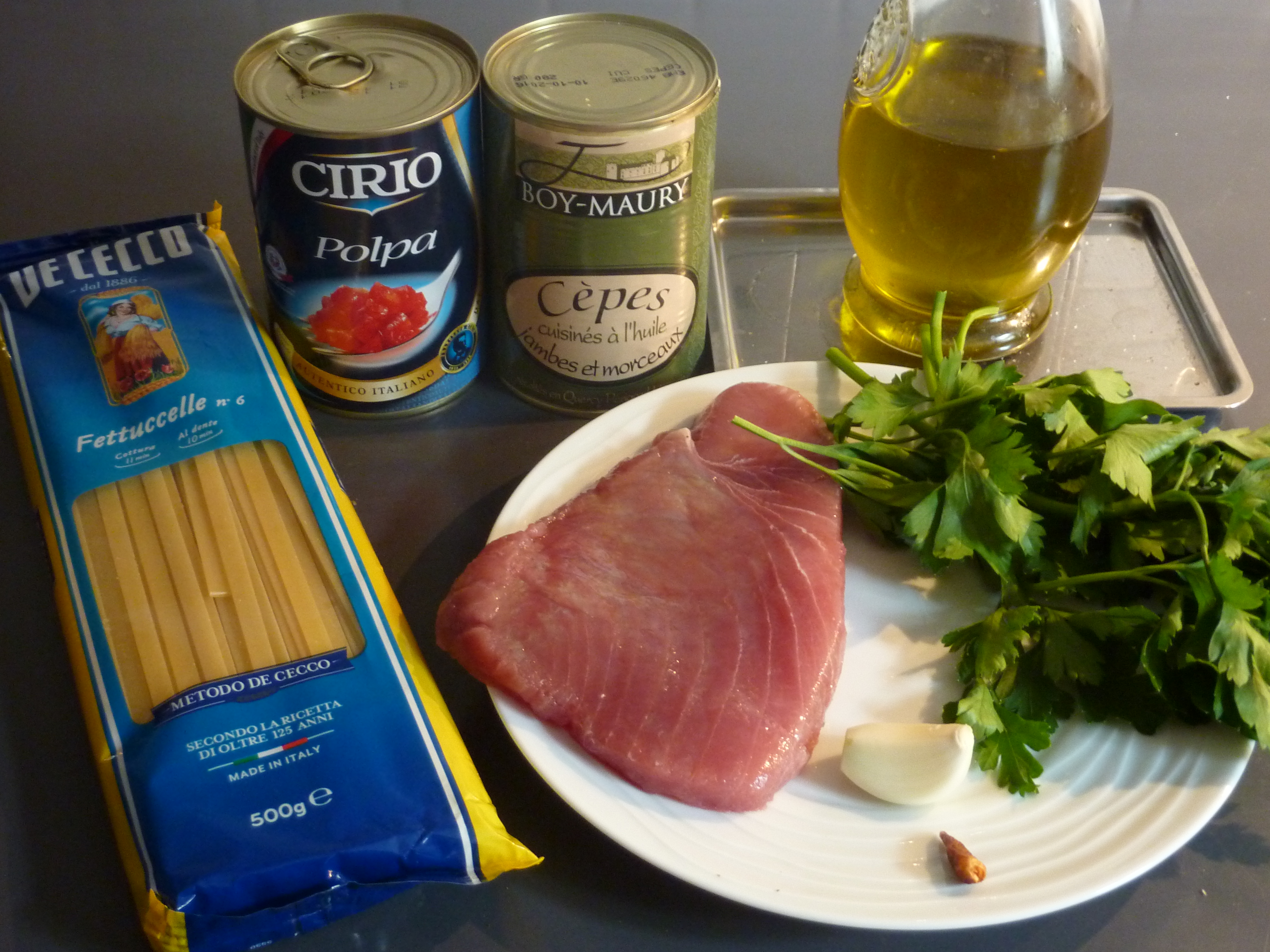 Voici comment la recette des pâtes à la carrettiera a conquis nos tables. C’est un mélange peu orthodoxe de champignons et de poisson, de pulpe de tomate, ail, piment et persil. En théorie, il faudrait y associer des cèpes frais, mais il fait chaud et je suis coincé à Paris, alors ceux en boîte feront l’affaire. En revanche, j’ai pu acheter des tranches de thon (pas rouge) de la Méditerranée. Hélas, le vendeur n’a pas su me dire si le morceau sur l’étal était bien de la ventresca (la partie de la cavité abdominale de l’animal, là ou les muscles sont plus riches en gras, et donc plus savoureux). De nos jours, il faut se contenter d’un poissonnier avec des connaissances de charretier…