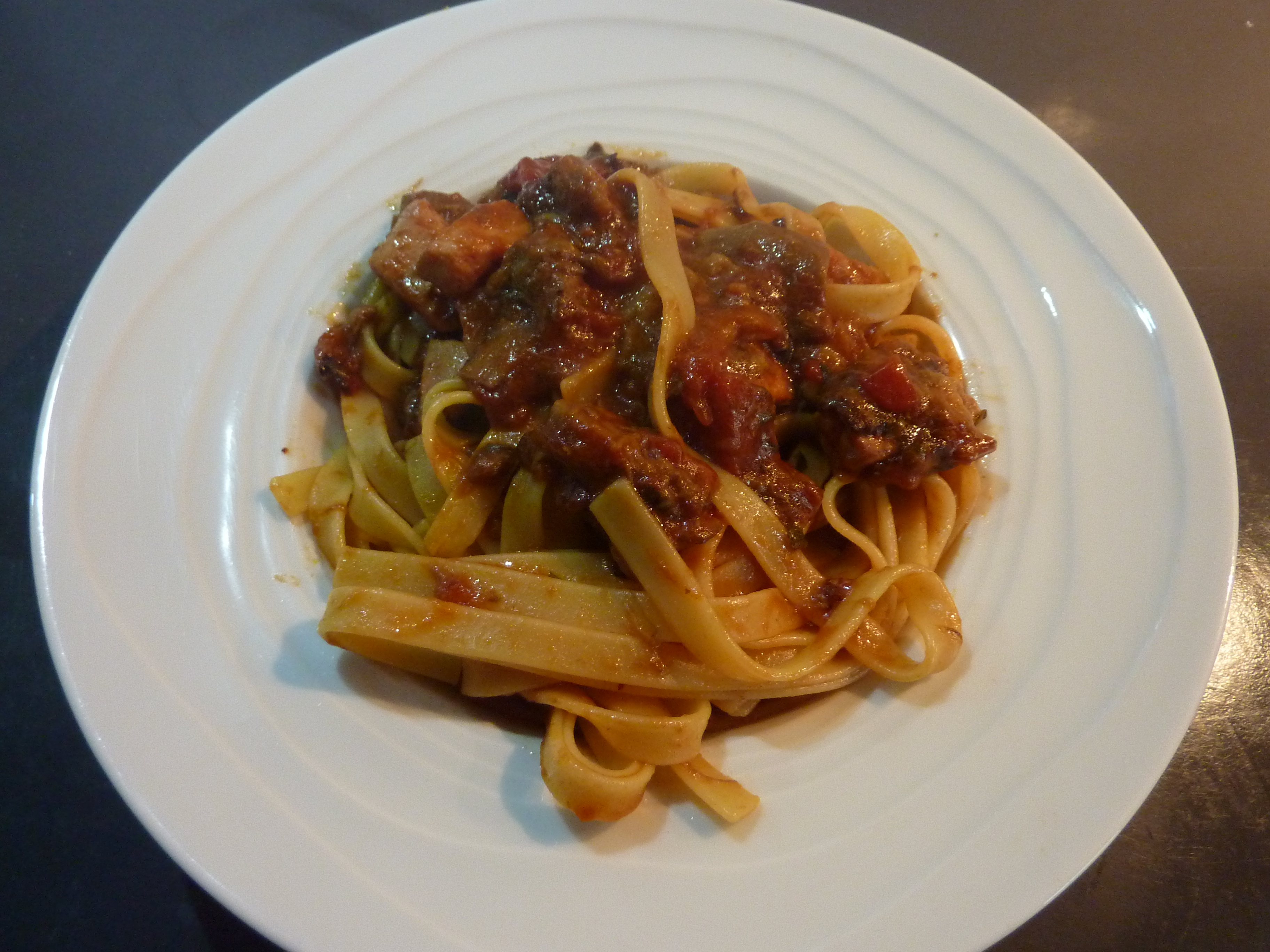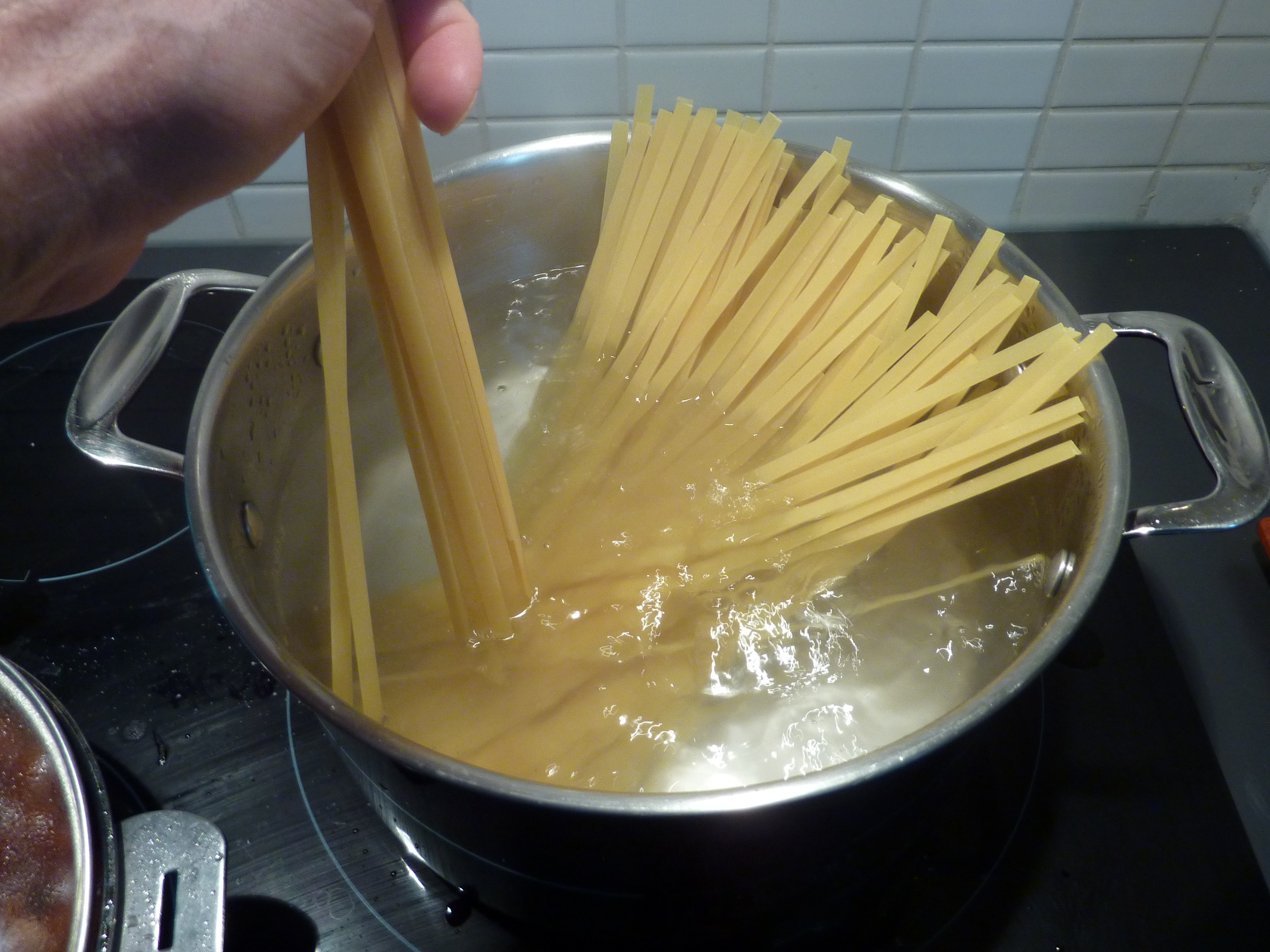 A la moitié de la cuisson, mettez à bouillir l’eau pour les pâtes. Et le moment venu, salez, et ajoutez soit des spaghetti, soit des linguine… de toute façon des pâtes longues.
