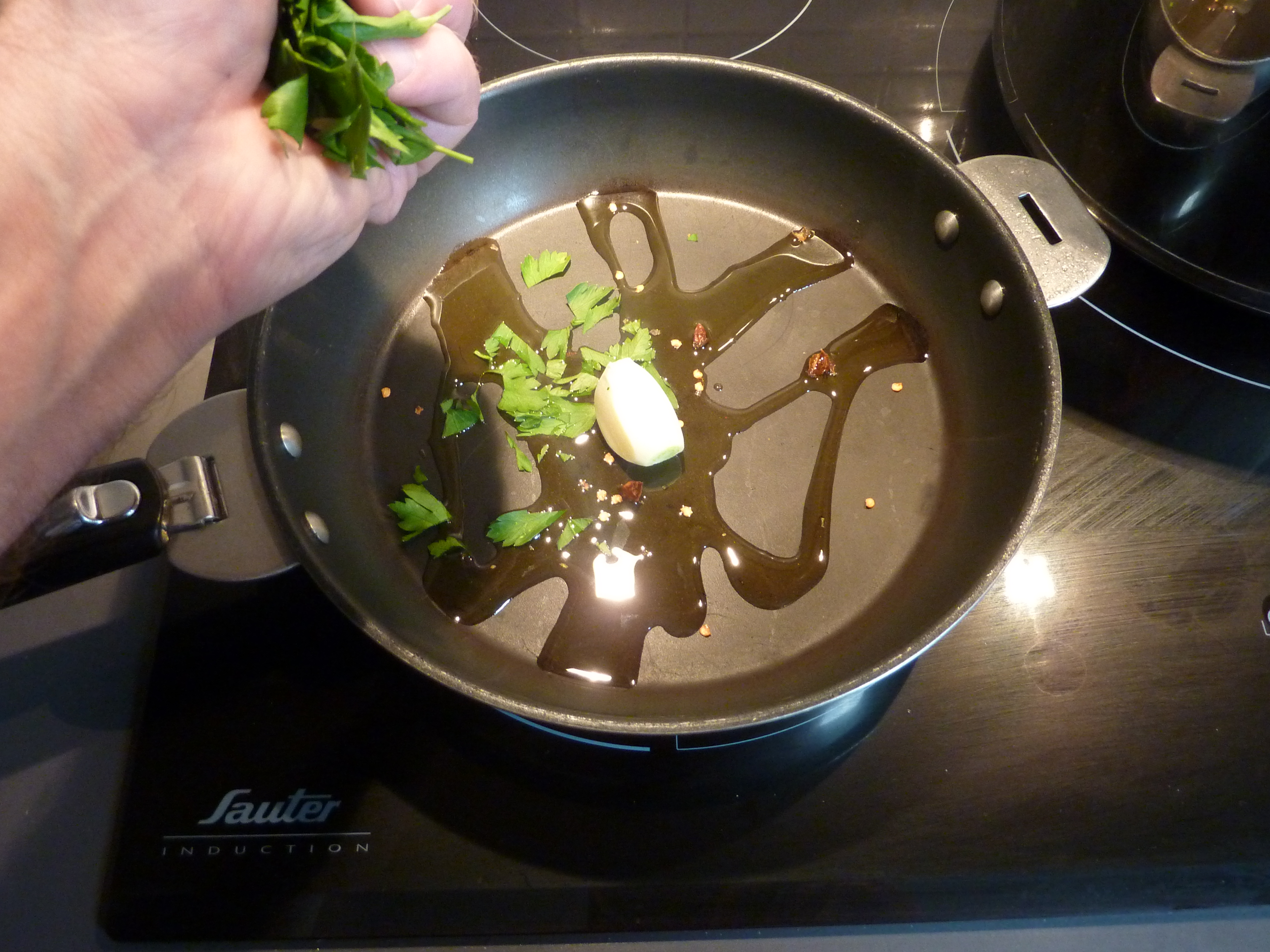 Emincez le persil, faites chauffer un peu d’huile extra vierge d’olive dans une poêle, et ajoutez d’abord une gousse d’ail, ensuite le piment écrasé, et enfin le persil.